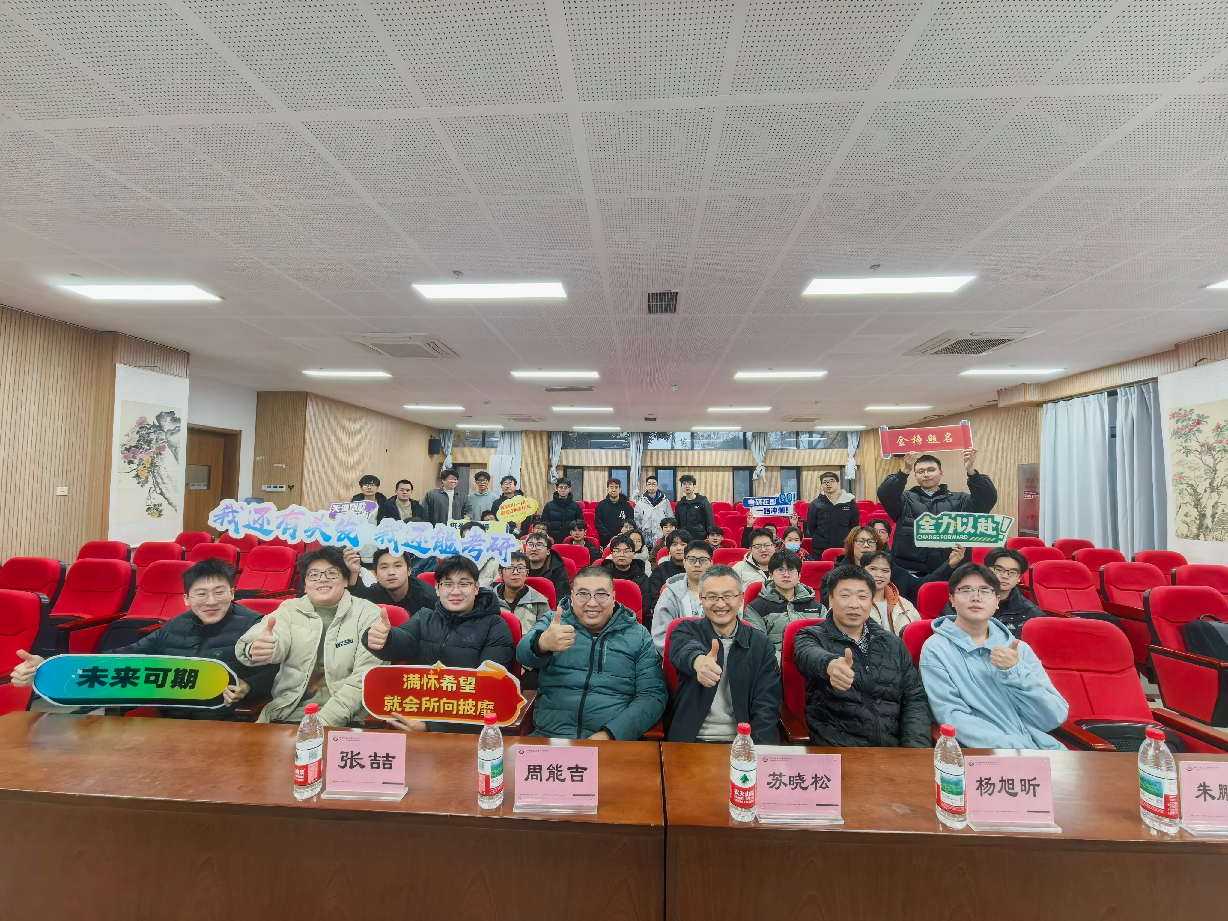 色花堂 党委副书记苏晓松、教工第一党支部教师周能吉、物理221班主任杨旭昕、物理学2025级研究生朱鹏晖、2026届考研同学出席大会,辅导员乔文琦主持。