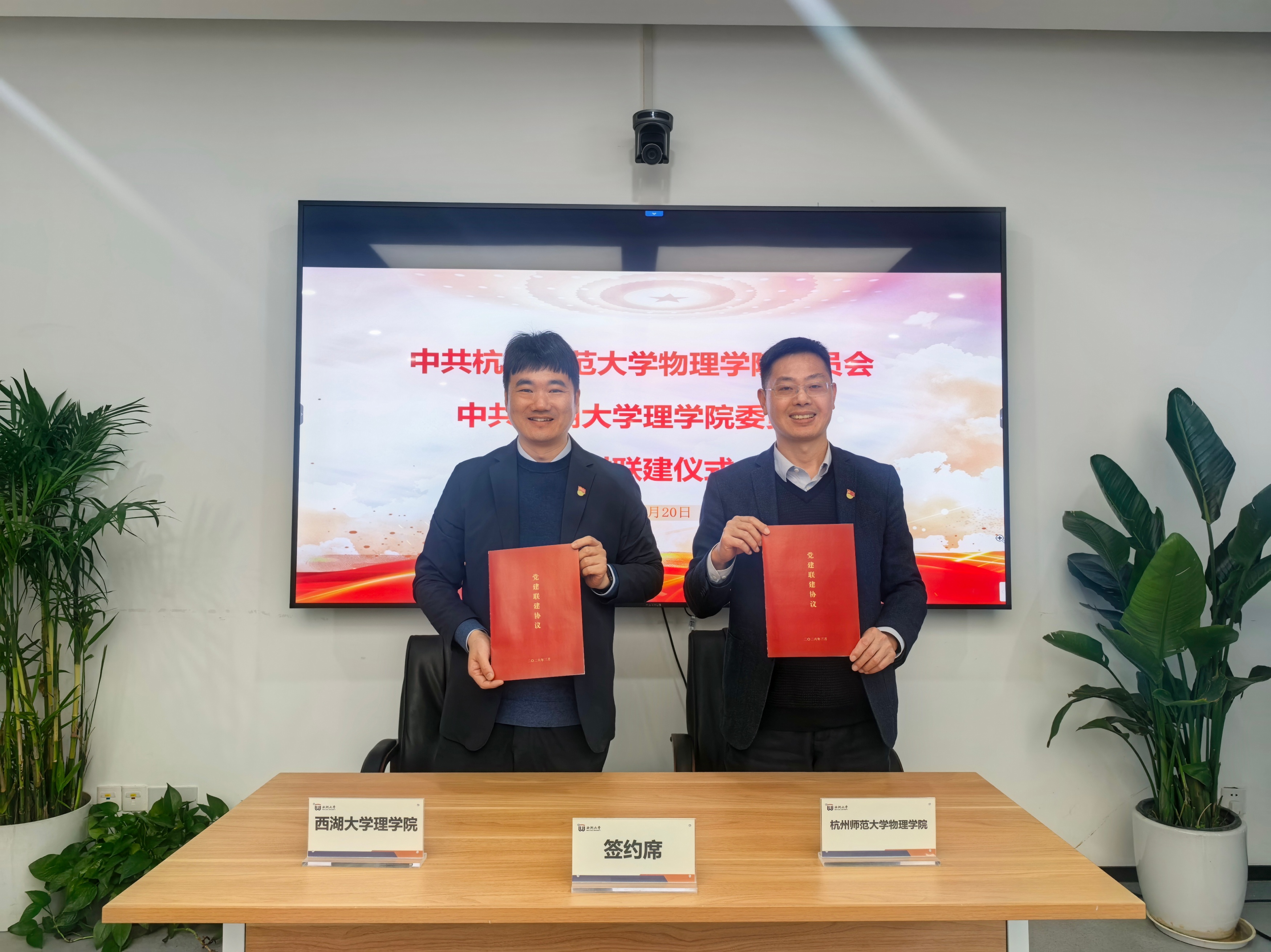 考察团首先参观了西湖大学展厅及校园,详细了解学校的发展历程、办学理念、设施环境,以及在教学科研、师资队伍建设等方面的先进经验和创新举措。参观结束后举行党委结对联建签约和座谈交流,何军与张国昌分别代表学院党委签署党建联建协议,标志着双方在党建引领下的深度合作正式启动。座谈会上双方围绕党建与业务融合、学科建设、人才培养等展开深入研讨。西湖大学理学院党委委员兰行行,物理系讲席教授吴从军,长聘副教授林效、朱伟等参与座谈。同时,西湖大学理学院教师还与色花堂 学生代表围绕学术成长与未来发展等话题开展座谈交流。