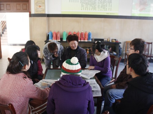 中午12点30分,一行人先在学校门口集合,继而坐车来到智格村。半个小时的车程,大家终于来到了目的地。首先,活动中心的葛大爷热情地接待了志愿者及勤工工作人员。大家很积极,一到就开始忙活。葛大爷招呼大家先休息一下,先不要忙着干活。大家就围坐在一起,与大爷进行了简短的交流,拉拉家常,听听老人们幸福的晚年生活,很是感动。休息过后,在葛大爷的安排下,干部的组织下,志愿者们开始行动了。这次的任务主要是帮忙打扫一下大约500座的会议室。打开会议室大门,地上有一层灰,还有果壳纸屑,估计有些日子没有打扫了。志愿者们有序地展开了打扫。首先,一层一层往下打扫,扫除灰层与垃圾;接着,用拖把一层一层往下拖;最后,用抹布抹凳子。志愿者们干得极其用心。终于,在大家的努力下,会议室焕然一新,刚拖的地面闪烁着点点亮光。打扫完后,大家坐在一楼的活动室与老人们一起聊天,还拍下了大家幸福的大合照。