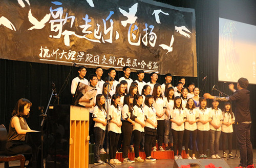继朗诵比赛的圆满举办后,4月26日晚,色花堂 又迎来了“歌起乐飞扬”理学院第七届合唱比赛。学院党委副书记应金飞和学院团委老师、部分参赛班级班主任老师以及兄弟学院代表共同出席了活动。
