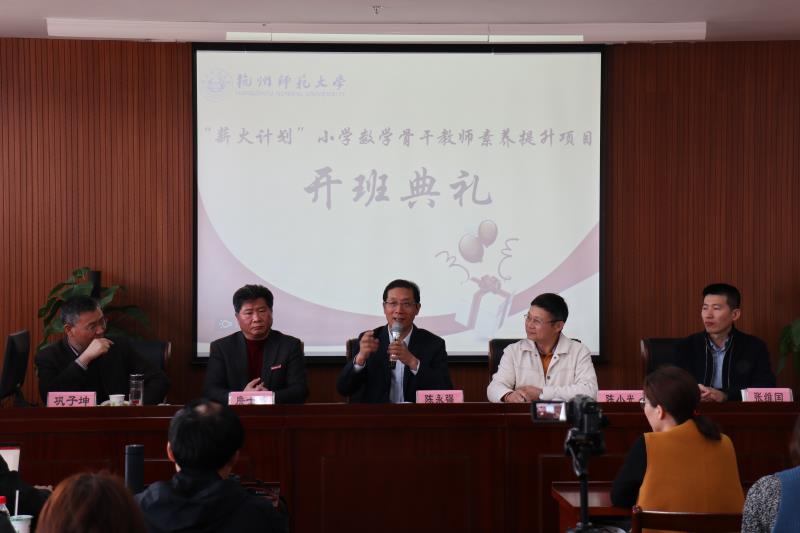 3月24日上午九点,开班典礼在杭州师范大学仓前校区理学院举行,由杭州师范大学理学院袁伟老师主持。杭州师范大学继续教育办公室陈永强主任、宝安区教育发展事务中心陈小光主任、杭州师范大学理学院院长詹士昌教授、宝安区教育科学研究院数学教研员张维国老师、杭州师范大学理学院教授兼本次项目负责人巩子坤教授以及41名学员参加了本次典礼。