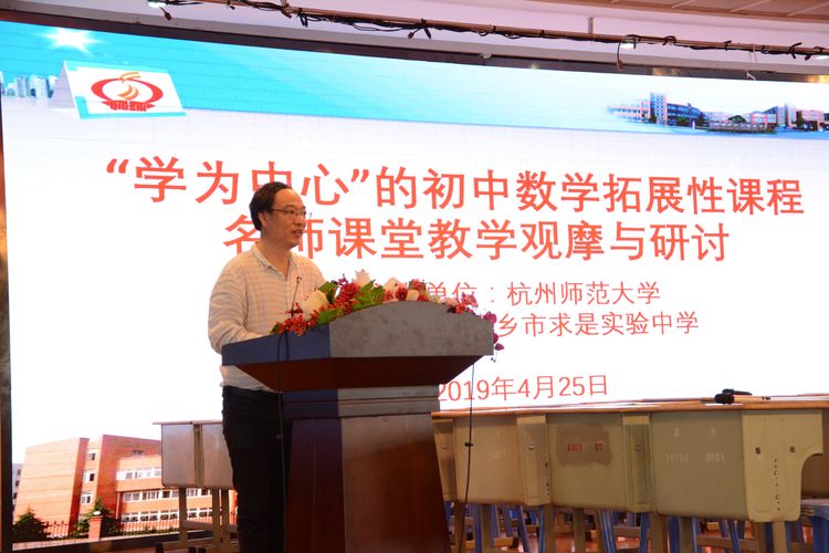 为进一步提高初中数学教师对拓展性课程的理解与实施能力,更新初中数学拓展性课程的教学理念,提高教师对课程资源开发、整合和运用的研究能力,2019年4月25日—26日,浙江省“学为中心”初中数学拓展性课程名师课堂教学观摩和研讨活动在桐乡市求是实验中学举行。本次活动由杭州师范大学理学院主办,桐乡市求是实验中学承办。出席本次活动的有原浙江省教育厅教研室初中数学教研员、苏步青数学教育一等奖获得者许芬英老师,浙江省教育厅教研室初中数学教研员、特级教师张宗余老师,经亨颐教师教育学院副院长叶立军教授,理学院继续教育中心汤剑文主任,以及全省各地的初中数学教师200多人。