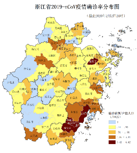 该项研究在浙江省县(市、区)教育局督导管理部门进行了广泛传播,为浙江省各地教育机构准确了解新型冠状病毒情况提供了很好的信息支撑。不同于当下大部分疫情分布图对确诊病例数的研究,本研究还采集各地常住人口和户籍人口数,以“五色图”的形式展示病例确诊率分布情况。