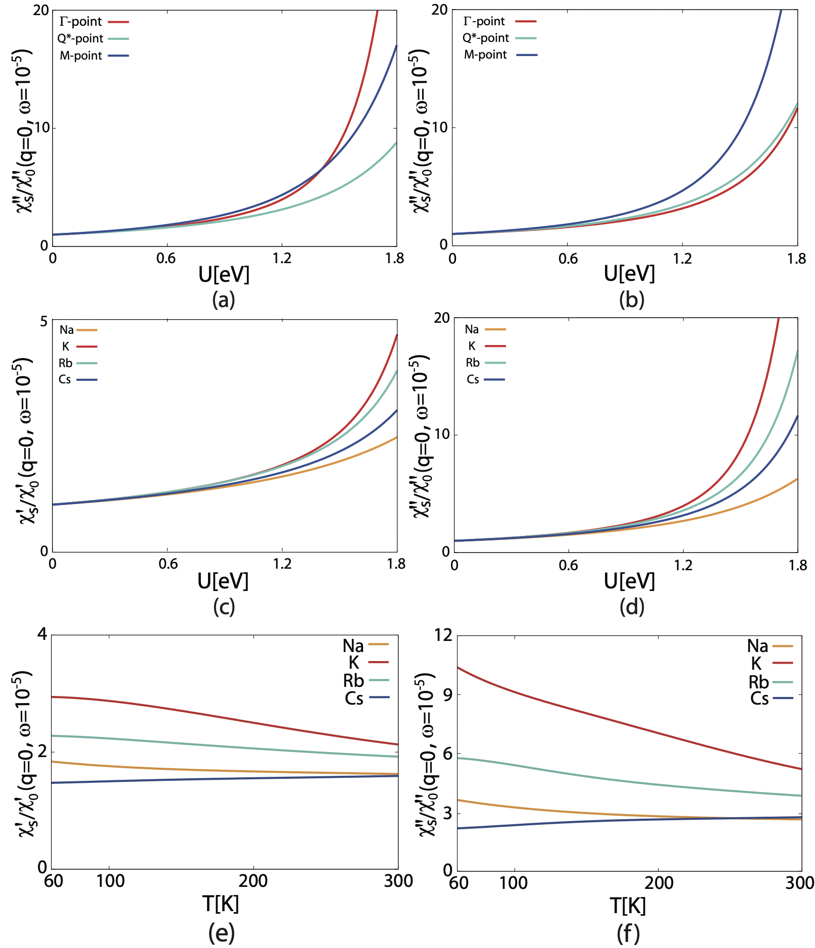 图 2. A2Cr3As3系列材料G点的自旋极化率随温度变化的趋势。详细说明参考论文图6及正文。