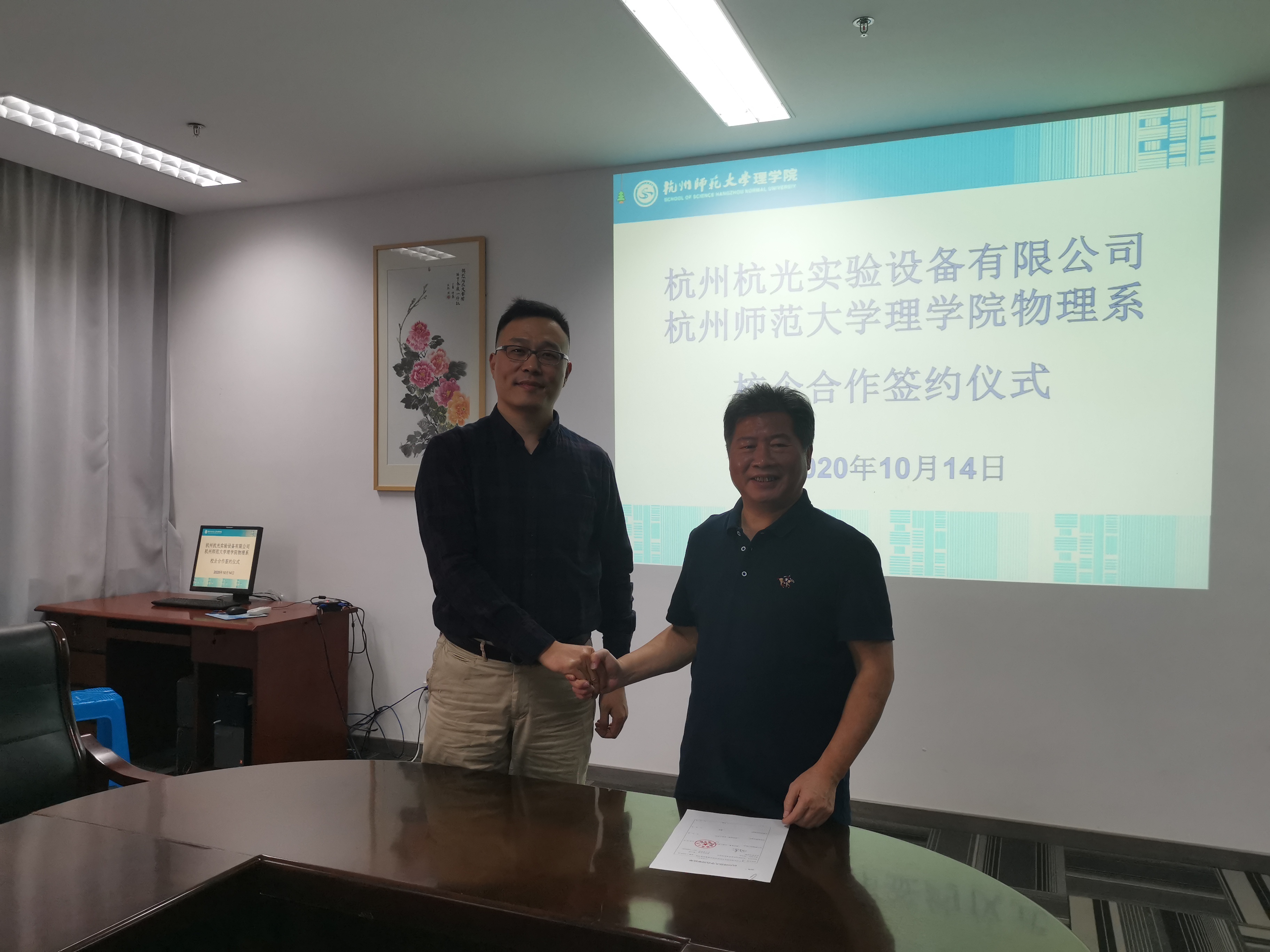 10月14日,由物理系举办的校企合作交流会暨专利转让签约仪式在理学院党员之家举办。院长詹士昌、教工第三党支部书记孙哲、大学物理实验教学中心副主任徐以锋及合作方杭州杭光实验设备有限公司总经理李玉斌共同参加会议,并签订了名为 “基于尺读望远镜及光杠杆的测定装置”的专利转让协议,标志着双方友好合作的开端。