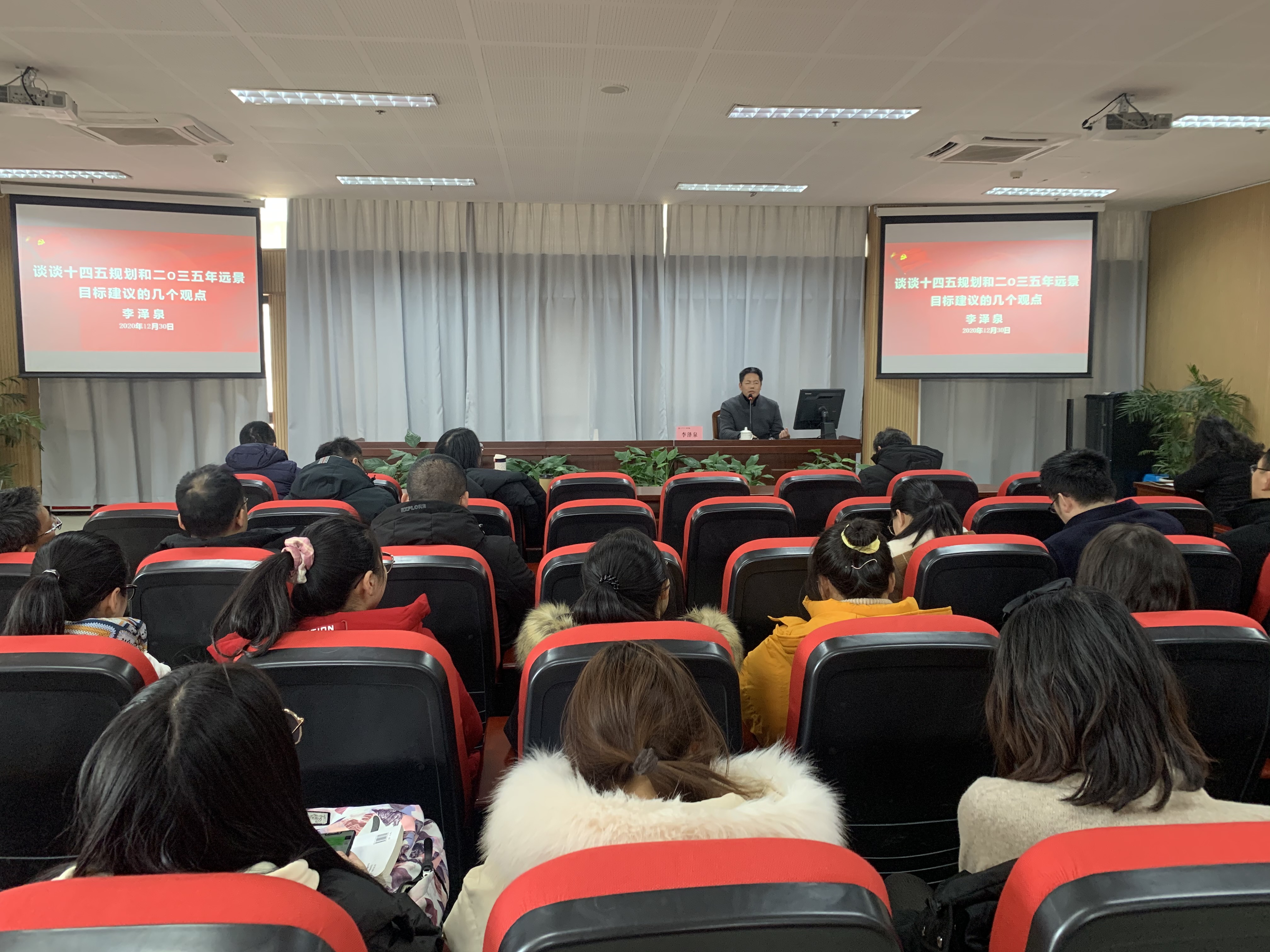 为了更好地学深悟透十九届五中全会精神,12月30日,校纪委书记李泽泉应邀来色花堂 作“谈谈‘十四五规划’和二〇三五年远景目标建议的几个观点”的报告,为学院教工党员解读五中全会精神。报告由学院党委书记王淑君主持,学院全体党委委员,理学院、生科院、材化学院的党支部书记、支委和部分党员参加了此次报告会。