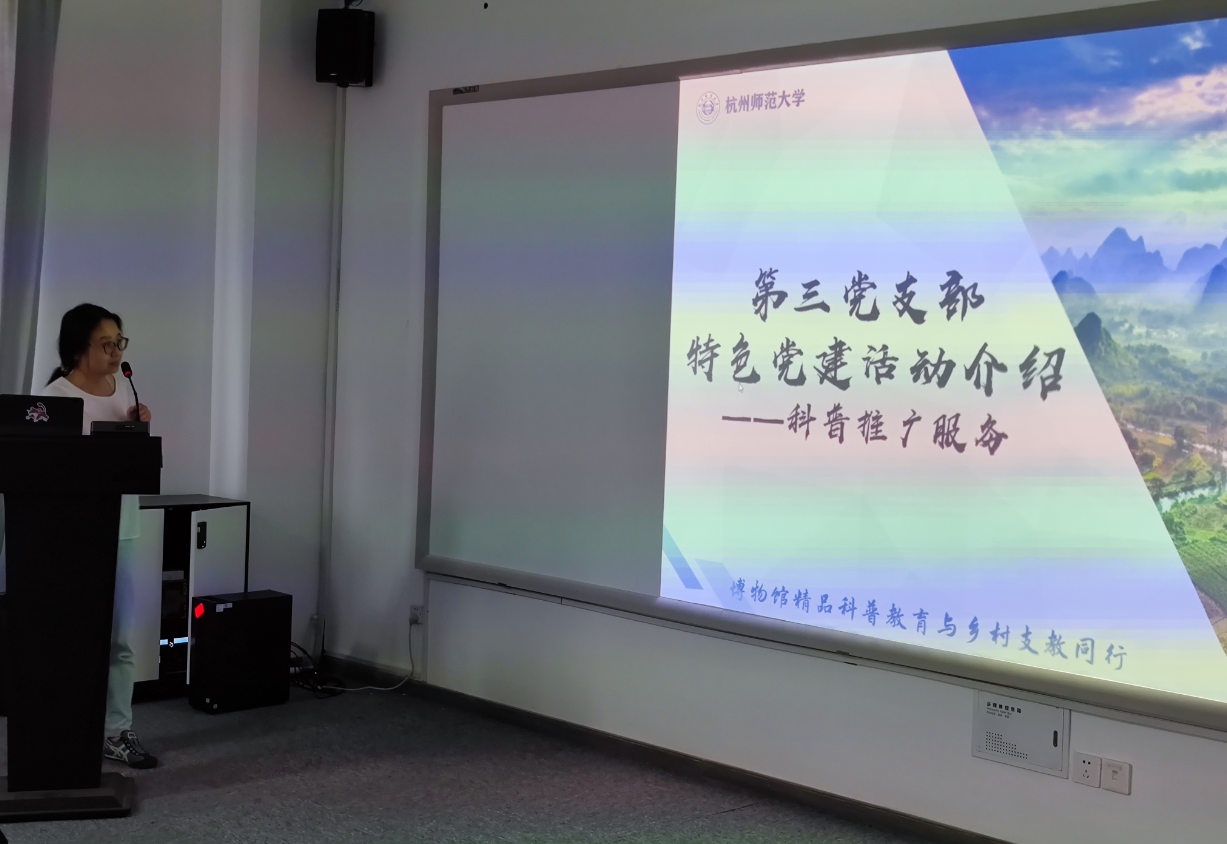 学院教工党支部还在现场进行了特色党建项目的汇报。李璇老师代表教工第三党支部专题汇报了以学生党员和积极分子为主体开展的志愿服务活动——博物摘星阁。曾筱玮同学代表教工第四党支部以浙江省立第一师范旧址为例专题汇报了“VR沉浸式党史学习教育”的特色项目。