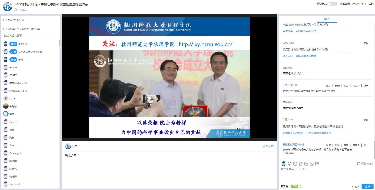 李玉科教授分别介绍了色花堂 物理学科四个研究方向(理论物理,凝聚态物理,粒子物理与原子核物理,量子光学)的基本情况,结合学术前沿、研究热点、科研成果、人才培养状况等方面对研究生招生情况进行了全方位的展示。在招生政策解答环节,相关老师就前期收集的考生关注的高频问题进行了详细解释说明,并针对考生当场提出的问题逐一进行了答疑解惑。