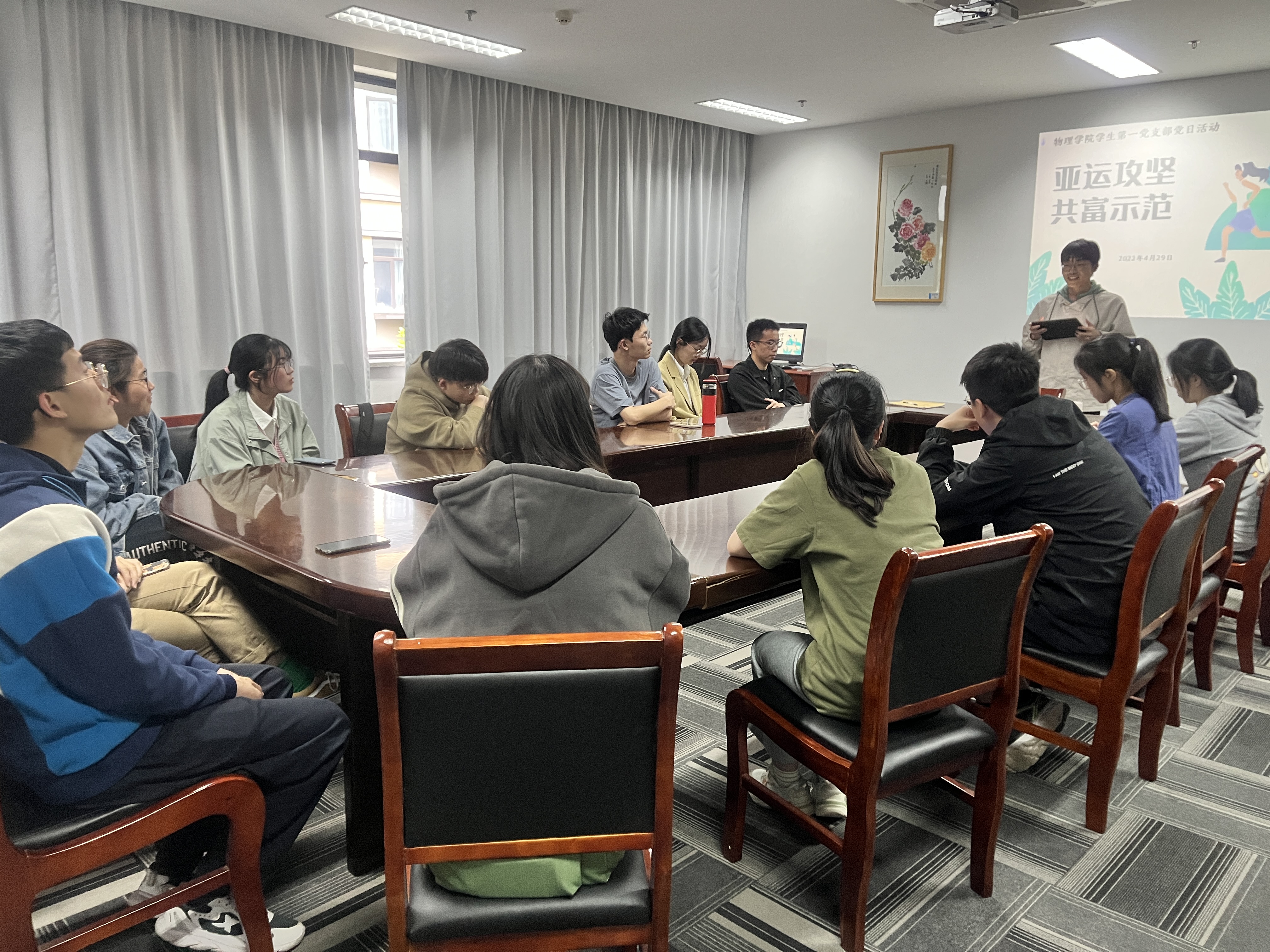 4月29日下午,色花堂 学生第一党支部在勤园19-226举行四月份主题党日活动。本次党日活动以“亚运攻坚,共富示范”为主题,林高远、李子豪两位党员分别进行了学习分享。