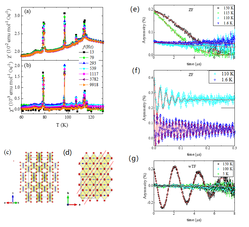 图(a,b)交流磁化率测量观察到的一系列铁磁转变; (c,d)沿不同方向所观察到的磁结构。(e)零场下的的SR测量结果,(f)观察到明显的缪子自旋进动,表明样品形成长程磁有序,(g)弱横场结果表明在转变温度以下磁有序的体积比几乎为100%。