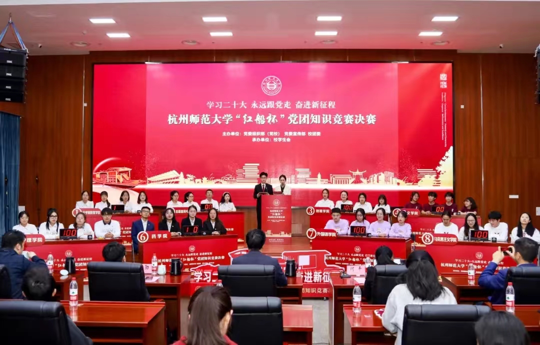 10月13日-19日,竞赛进行了前期线上选拔,全校一万八千余名师生通过“杭州师范大学智慧校园”APP进行在线答题,完成赛前“练兵场”与初赛环节。在全院师生共同拼搏努力之下,色花堂 从全校20多个参赛单位中脱颖而出,成为八支入围决赛的队伍之一。决赛设置了必答题、抢答题、党的二十大精神专项题3个环节,以现场答题的形式进行。