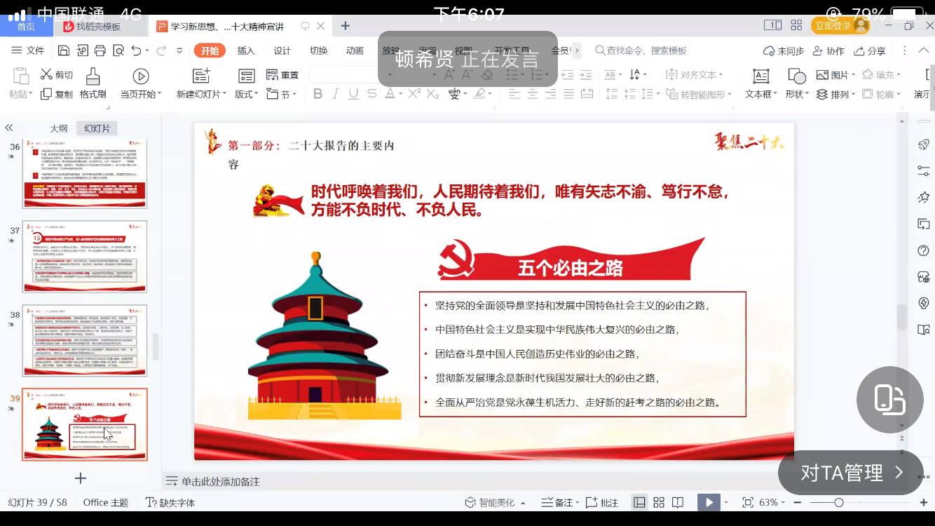 本次邀请到的宣讲老师是辅导员顿希贤老师。顿老师非常细致、系统地为我们分点介绍了二十大报告的主要内容,让同学们认识到党“矢志不渝、笃行不怠”的决心,“不负时代、不负人民”的信念,在报告的方方面面中都体现得淋漓尽致。相信通过本次活动,同学们能更加坚定地高举中国特色社会主义伟大旗帜,为推进中华民族伟大复兴而不懈奋斗。