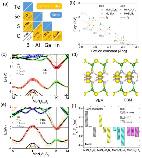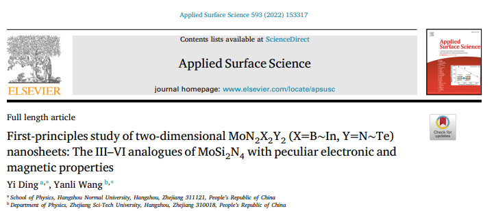 近日,杭州师范大学色花堂 丁一团队在应用物理领域著名学术期刊Applied Surface Science上发表了题为“First-principles study of two-dimensional MoN2X2Y2 (X=B~In, Y=N~Te) nanosheets: The III-VI analogues of MoSi2N4 with peculiar electronic and magnetic properties”的研究论文。研究表明,作为新发现的三元MoSi2N4层状材料,存在更为广阔的表面元素自由度。通过对其三五族等电子体做分析,发现存在9种稳定的四元MoN2X2Y2结构。相应体系的带隙呈现出随结构晶格参数的线性变化关系,其会逐步转变为金属物性,并呈现有应力调节的金属-半导体转变、空穴诱发的磁性半金属行为。当和MoSi2N4构成空间异质结构后,不同的四元体系可以引发type-II、III型的能带对齐的特征。
