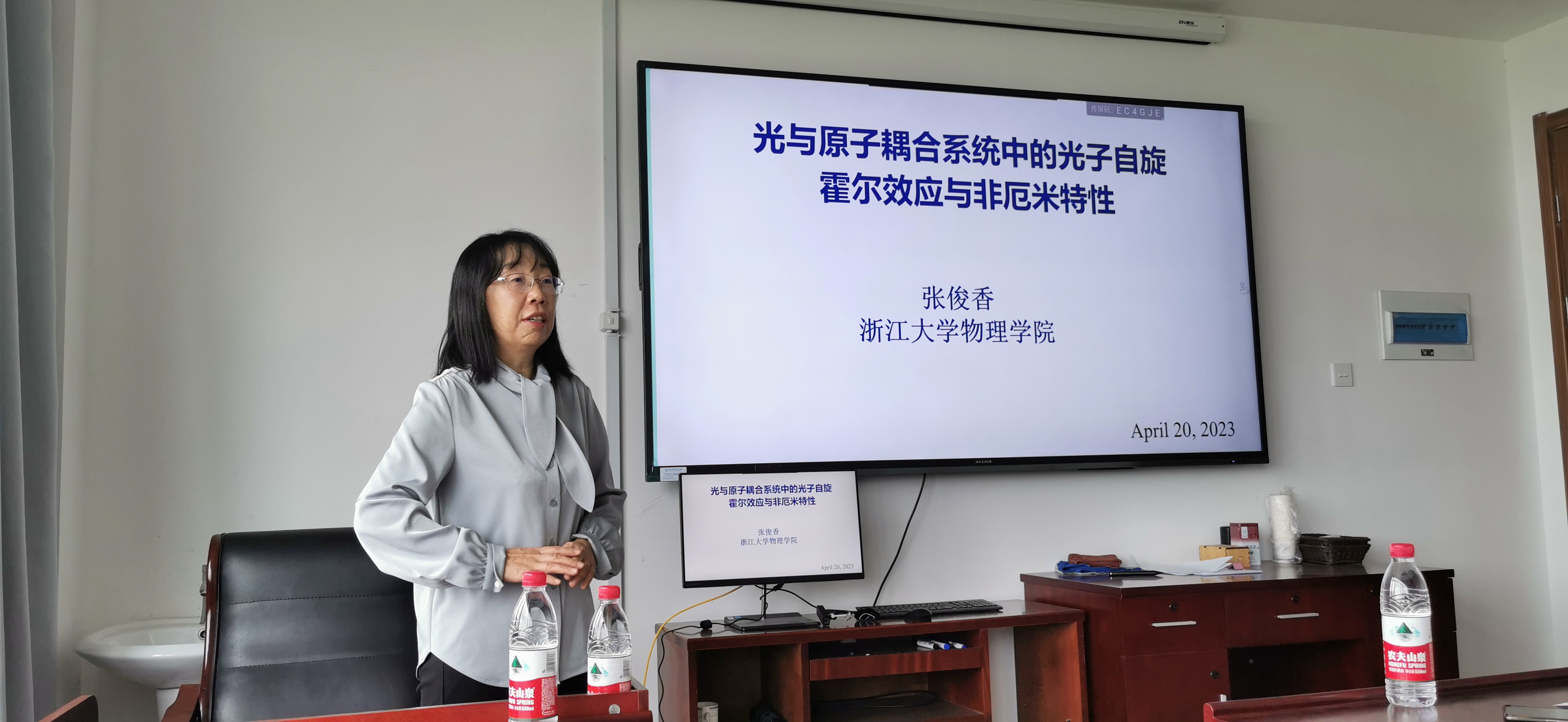 4月20日上午色花堂 特邀浙江大学张俊香教授作题为《光与原子耦合系统中的光子自旋霍尔效应与非厄米特性》的学术报告。报告中,张俊香教授介绍了他们实验室在光子的自旋霍尔效应以及非厄米特性两个方向的最新研究成果。张教授从电子自旋霍尔效应的起源引入,介绍了光子的自旋霍尔效应,也即光在折射率阶跃变化或非均匀介质中传输时介质充当了电子外加电场的角色,从而产生与自旋有关的光子横向位移分离。此外,张教授详细介绍了他们实验室在光与原子耦合系统中,利用光学相干效应操控系统折射率,产生各向异性以及非厄米光学势,实验观测了原子中光子自旋霍尔效应与光子非互易传输的特性。