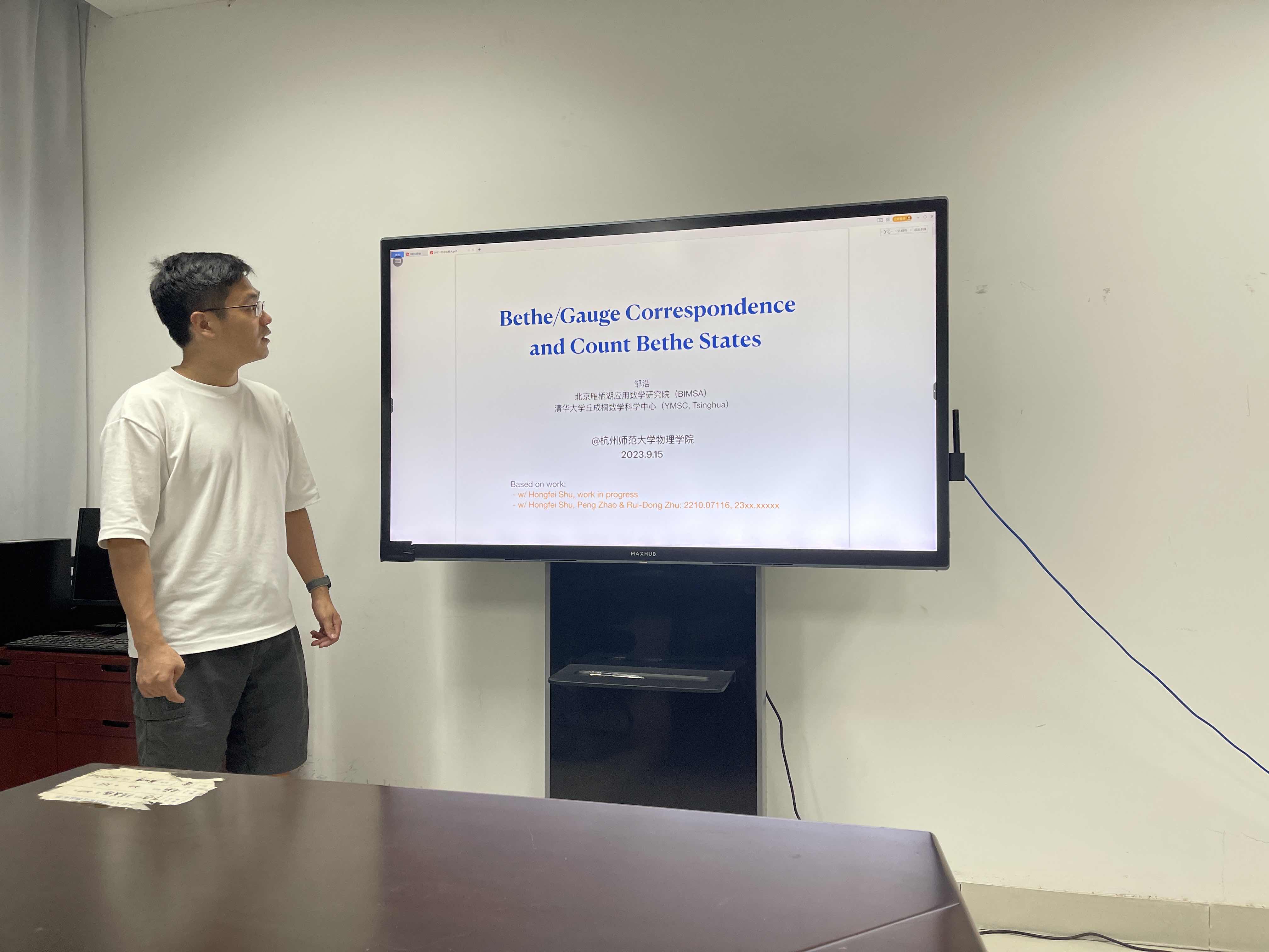 9月15日下午,北京雁栖湖应用数学研究院和清华大学丘成桐数学科学中心的邹浩士博士应邀来色花堂 ,为院内师生带来了一场精彩的学术报告。报告的题目是《Bethe/Gauge Correspondence and Count Bethe States》,主要介绍了可积系统里Bethe States的数态问题,Bethe/Gauge Correspondence的对应关系,以及如何把Bethe/Gauge Correspondence应用到超对称规范场论里解决数态问题。