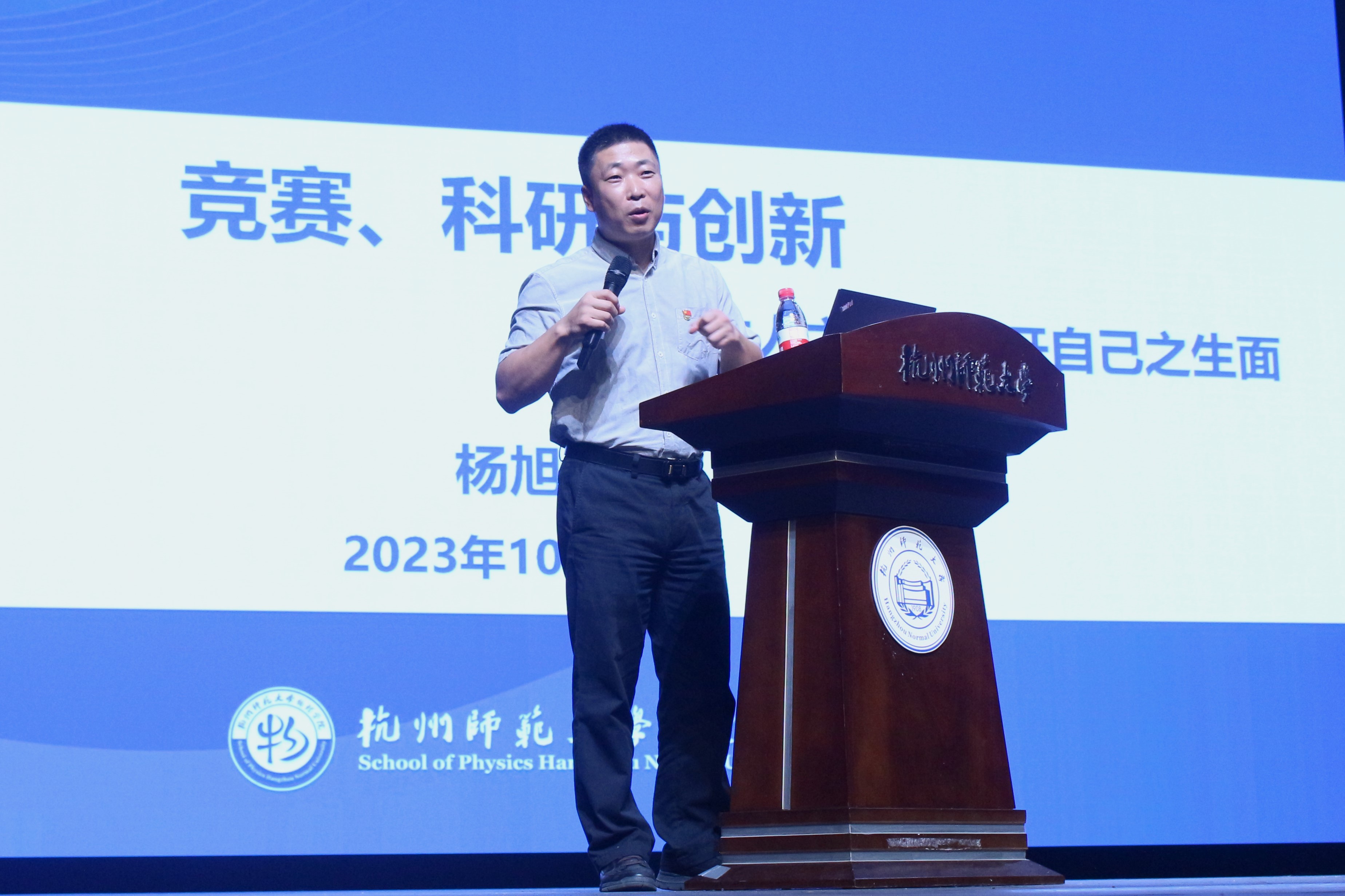 讲座伊始,杨老师通过历史上“老杨”(杨志发)发现秦始皇兵马俑的故事,引入本次“竞赛、科研与创新- -以古人之规矩,开自己之生面”的主题讲座,并且通过邓稼先、钱学森、黄大年、孙家栋、杨振宁等伟大物理学家的先进事迹和爱国故事阐明了“理论联系实际”和“家国情怀”在创新过程中的重要性。