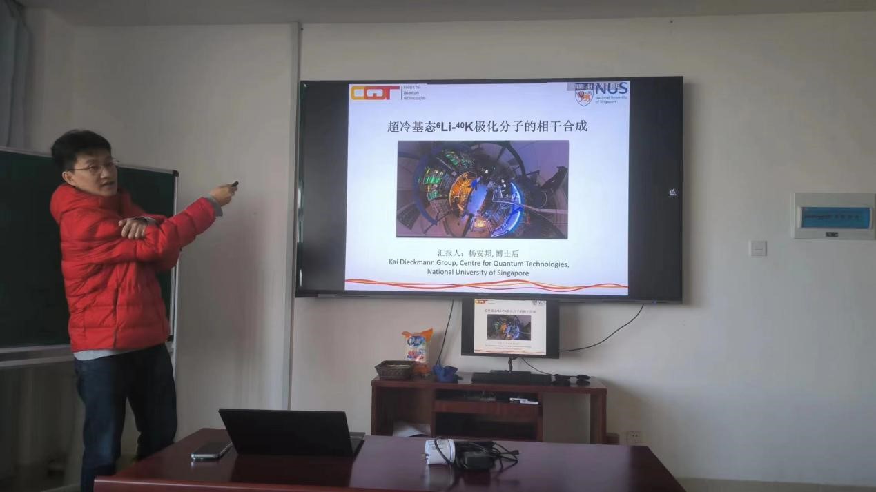在本次报告中,杨安邦博士介绍了他所在的课题组关于超冷基态6Li-40K极化分子的相干合成的工作。超冷极化分子相比于超冷原子体系有着长程的偶极相互作用和更丰富的内禀自由度,因此可以为研究多体量子物理和量子化学提供更多的机会和选择。该团队提出了一条新颖的研究冷分子基态光谱的路径(PRL 124,133203(2020)),并自主搭建了两台窄线宽且低相噪的外延腔二极管激光,通过理论分析与实验结合的方式,首次且高效率地通过STIRAP实现了基态6Li-40K分子的相干合成,效率达到了96%,目前为该领域报道过的最高效率。报告结束后,杨博士与现场的老师进行了热烈的交流和讨论,激发了大家对超冷原子分子物理研究的兴趣。