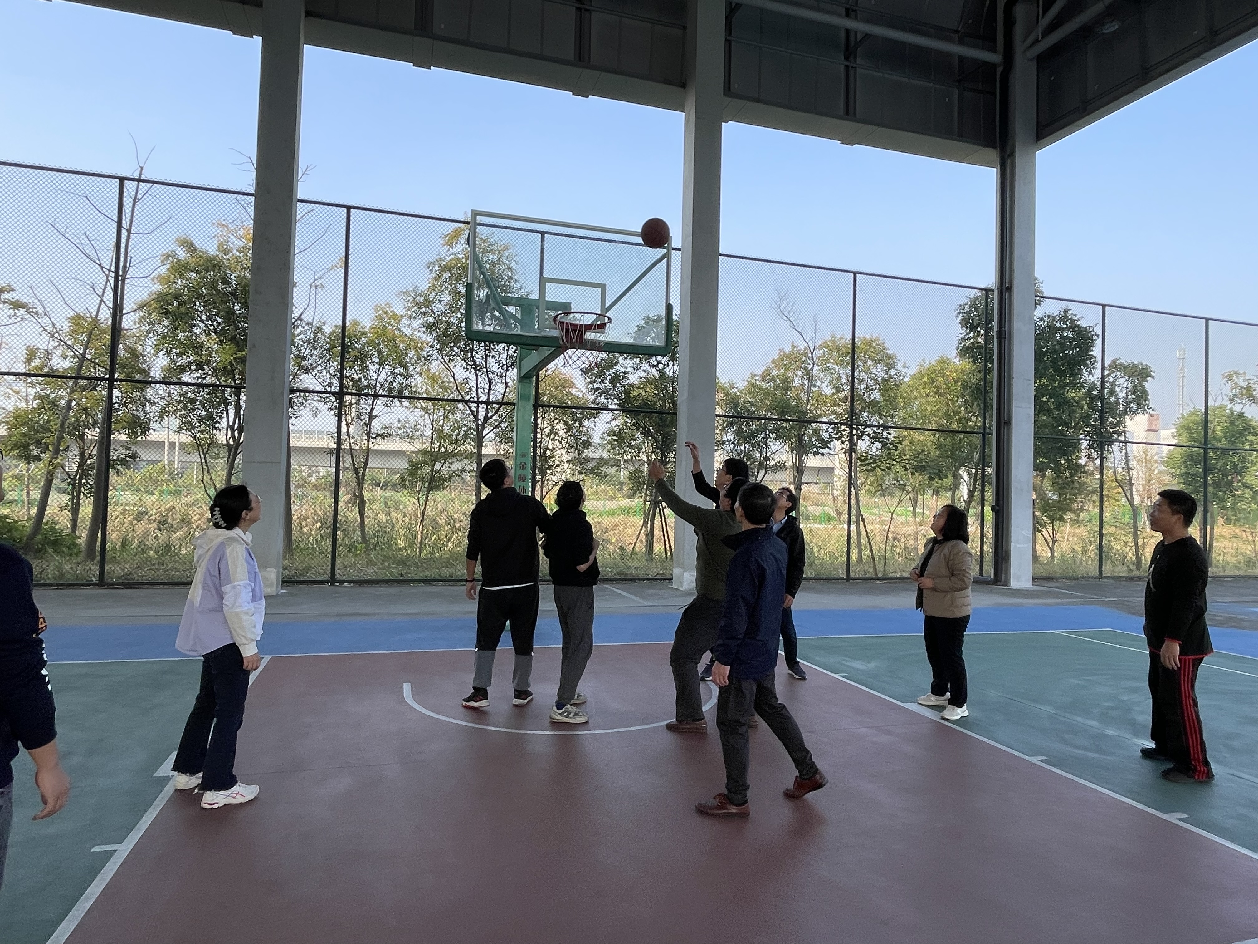 投篮比赛结束,大家意犹未尽,又兴致勃勃地分组打起了篮球半场5v5比赛,之后还进行了气排球比赛。