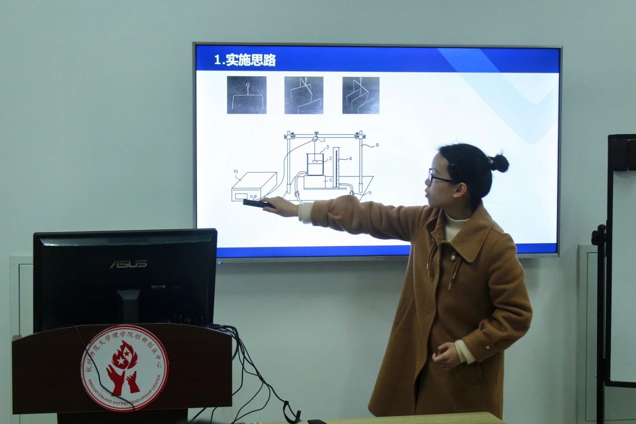 洪煊煊同学代表团队从实施思路、现有成果两个方面展示了他们对液体表面张力系数实验仪器的改进以及研究进度,并且阐述了下一阶段的研究计划以及对预期成果的设想。该小组的实验仪器改进,使实验更加容易操作以及便于学生对于液体表面张力系数本质的了解,展现了大学生对于大学实验的充分思考以及灵活运用。
