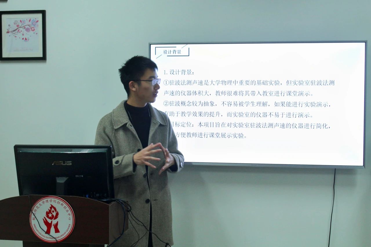 韩云飞同学代表团队开篇阐述设计背景,讲明了制作便携式声速测量仪的想法来源,随后清晰描述仪器的实验原理以及仪器中各个部分的对应功能,并且制作了相应的动画生动演示了实验仪器使用过程。该声速测量仪相较于实验室传统的声速测量仪更加的便捷,体现了大学生关于如何更好地将实验带入课堂的问题的不断探索。