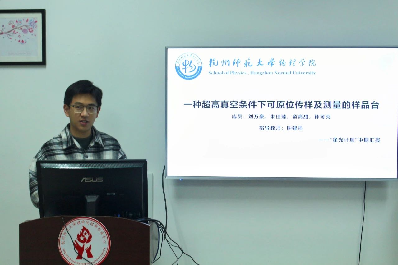 刘万豪同学代表团队开篇点明了实验室搭建的超高真空红外光谱仪所存在的一些问题,从而引出他们所研究的一种在超高真空条件下可原位传样及测量的样品台,其通过3d建模的展示了该零件的部分三视图以及已经完成组装的样品台实物图。体现了大学生对实验仪器改进的深入思考以及将现代技术融入创新研究的能力。