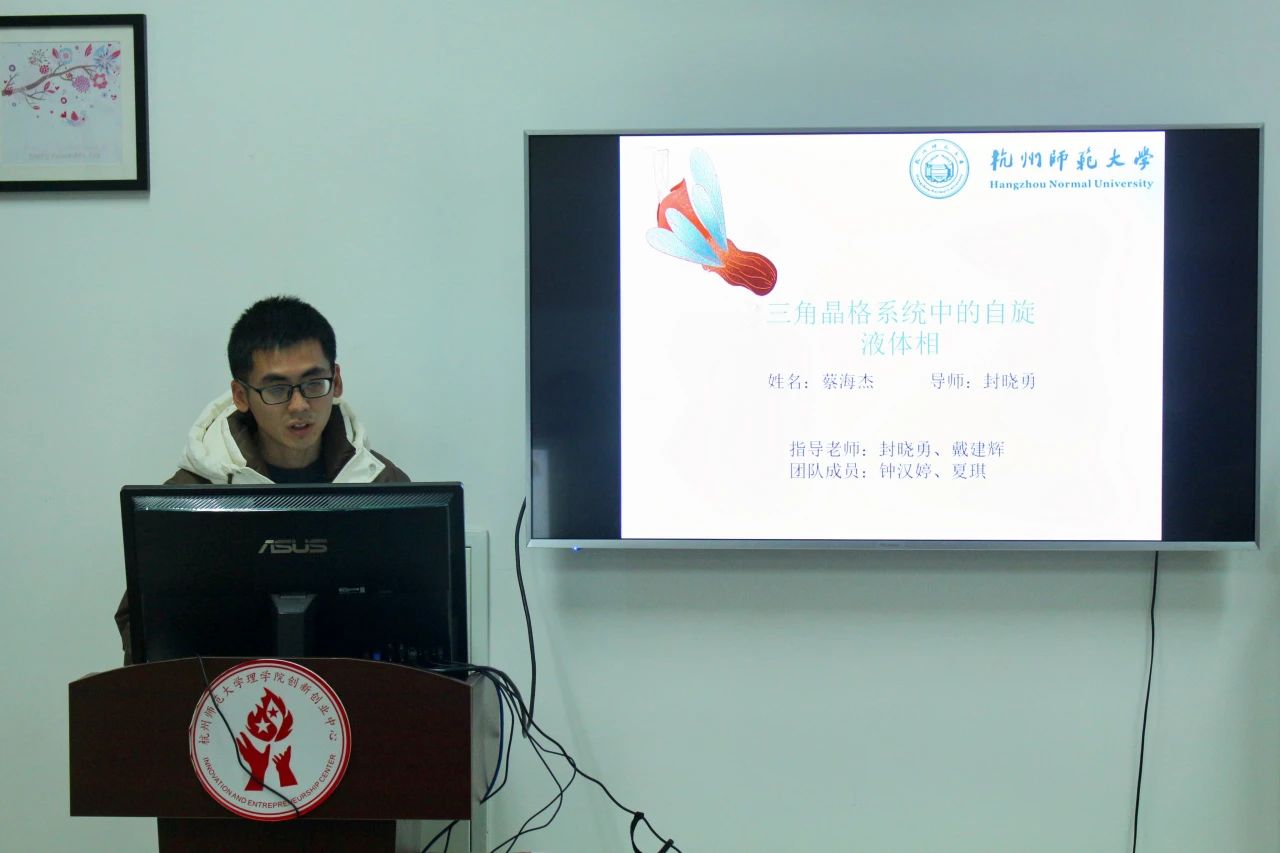 最后,蔡海杰同学代表团队从研究方向、研究模型、研究方法三个方面阐述了关于三角晶格系统中的自旋液体相的研究。在汇报过程中,其详细的讲解以及清晰明了的数据曲线图,展示了他们深厚的专业知识和对他们所研究项目的深入理解。