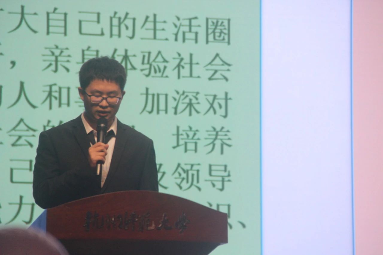 紧接着,暑期社会实践优秀个人进行分享。季锦翔同学以轻松诙谐的口吻向我们分享了在暑期协助市场监督管理的经历,拓展了法律知识,见证了真实案例;作为小青荷的陈哲同学用照片展示了在亚运会期间的点点滴滴,积极鼓励同学们参加志愿活动,为自己的生活增添一抹色彩;身为演职人员的李天艺同学讲述了备战亚运期间咬牙坚持,站在亚运舞台后舞出精彩、舞出杭师姿态的骄傲与自豪;祝赟和曹美晓同学代表的“博物摘星阁”前往博物馆,为中小学生科普科学知识,安排科学活动,分享科学趣闻,从多方面探索教育新途径;徐李想同学所在的Fun飞理想夏令营团队扎根乡村,参与支教,展示了与孩子们相处的时间片段,体现支教成员的爱与责任。随后,色花堂 对4支院级优秀团队和11位院级先进个人进行表彰,激励各团队、个人再接再厉,继往开来。