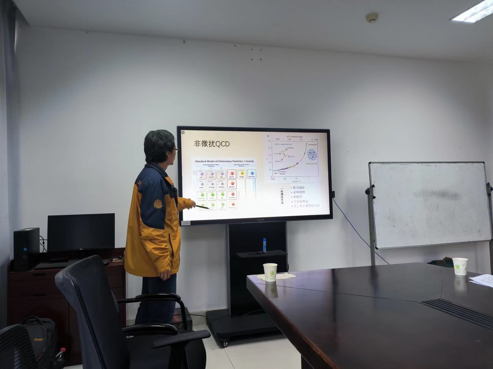 12月12日,学院邀请了中国科学院高能物理研究所朱凯副研究员,做主题报告“北京谱仪上的(类)粲偶素物理”。报告介绍了利用北京谱仪获取的正负电子对撞数据开展的三个与(类)粲偶素物理相关的测量:一是12%规则及新12%规则,二是过程的测量,三是电磁相互作用与强相互作用振幅之间相对相角的测量,并探讨其中的物理机制及对未来的展望。