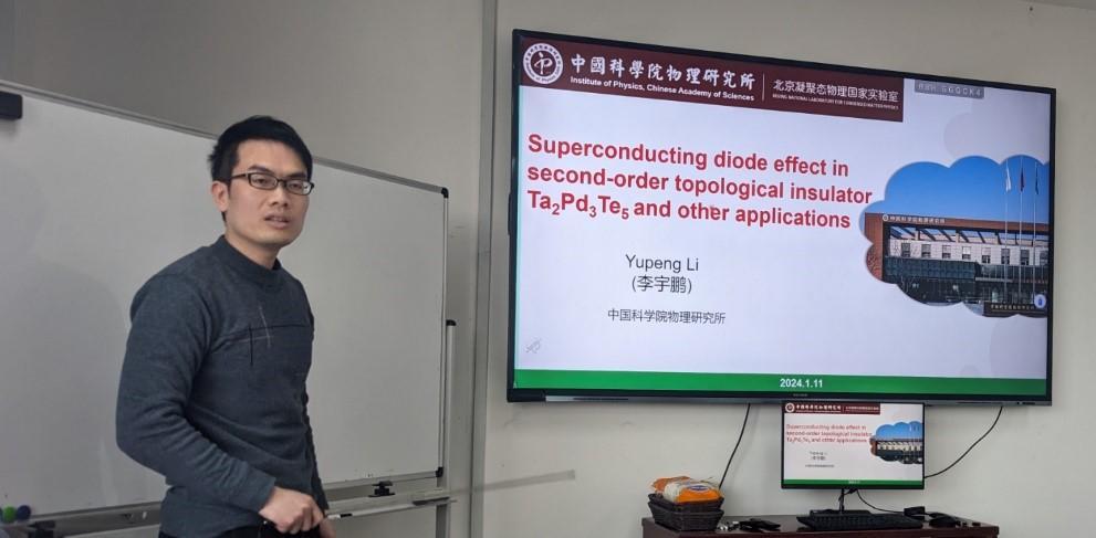 2024年1月11日下午,中国科学院物理研究所的李宇鹏博士应邀来色花堂 作题为“二阶拓扑绝缘体Ta2Pd3Te5的超导二极管效应及其他应用研究”的学术报告。李宇鹏博士主要从事拓扑和超导材料的物性探索以及其在二维器件中的非常规输运研究。