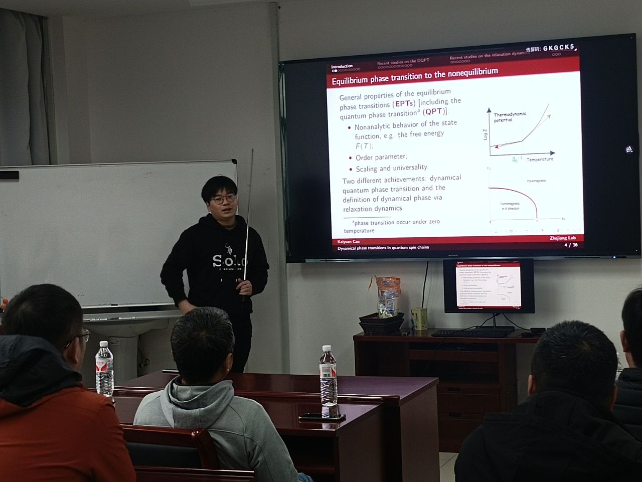 3月14日上午,色花堂 举办了色花堂 系列讲座,邀请了之江实验室助理研究员曹凯源博士作题目为“量子自旋链中的动态相变”的报告。曹博士的研究领域涵盖量子相变、量子多体系统的动力学行为以及机器学习与统计物理的交叉学科。他在国内外著名物理期刊如Phys. Rev. B、J. Phys.: Condens. Matter等发表了7篇SCI论文。