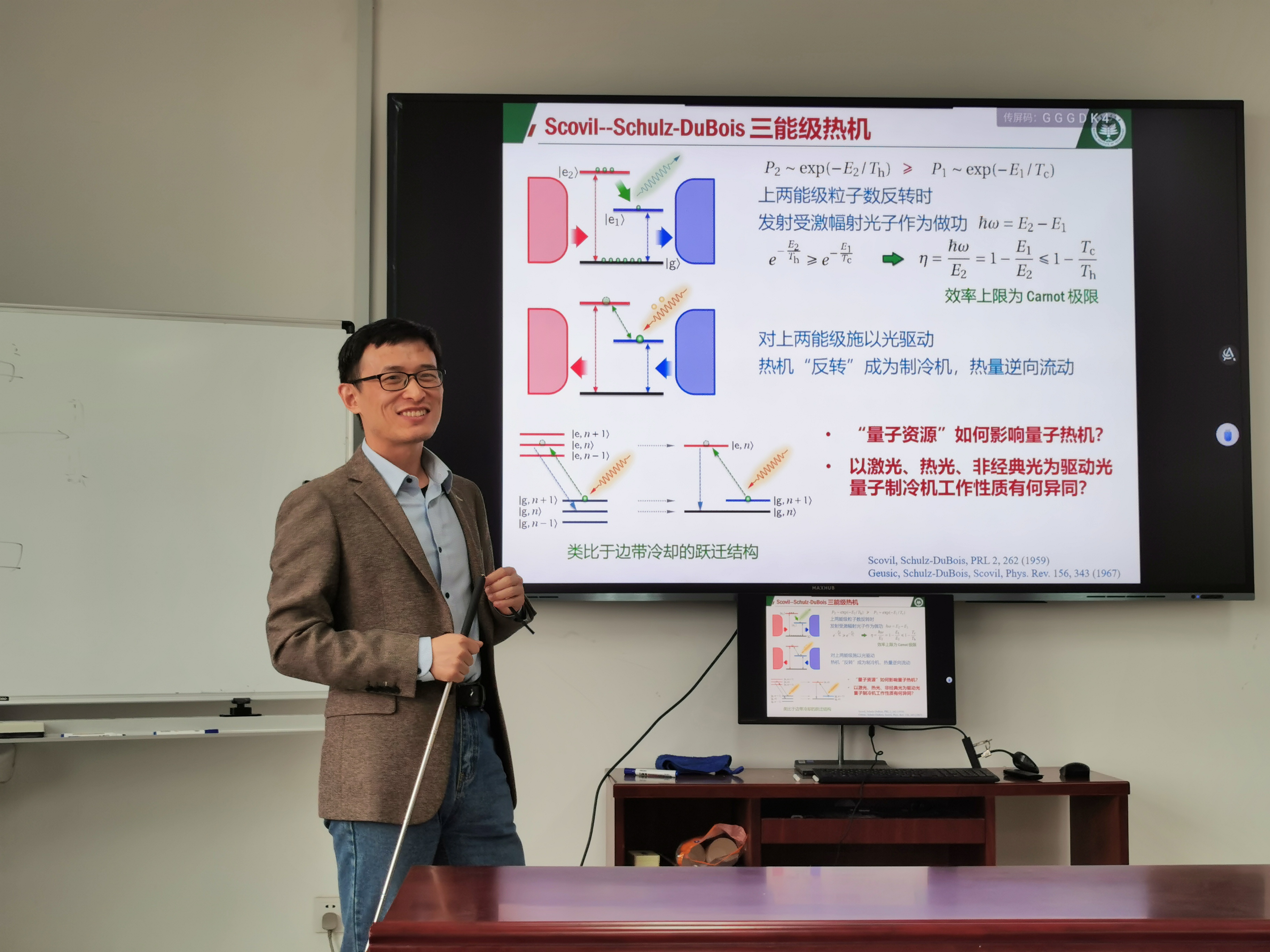 4月12日下午,北京理工大学李圣文副研究员应邀来色花堂 作题为“非经典光驱动的量子制冷机”的学术报告。非经典光在量子精密测量等领域有着广泛应用。报告中,李圣文研究员介绍了一个由多能级构成的量子制冷机,在驱动光作用下可驱使热量由低温热源流向高温热源。当分别以单模激光、热光、非经典反聚束光作为驱动光时,此量子制冷机产生的制冷功率在相同强度下,以激光作为驱动光时制冷功率最大。