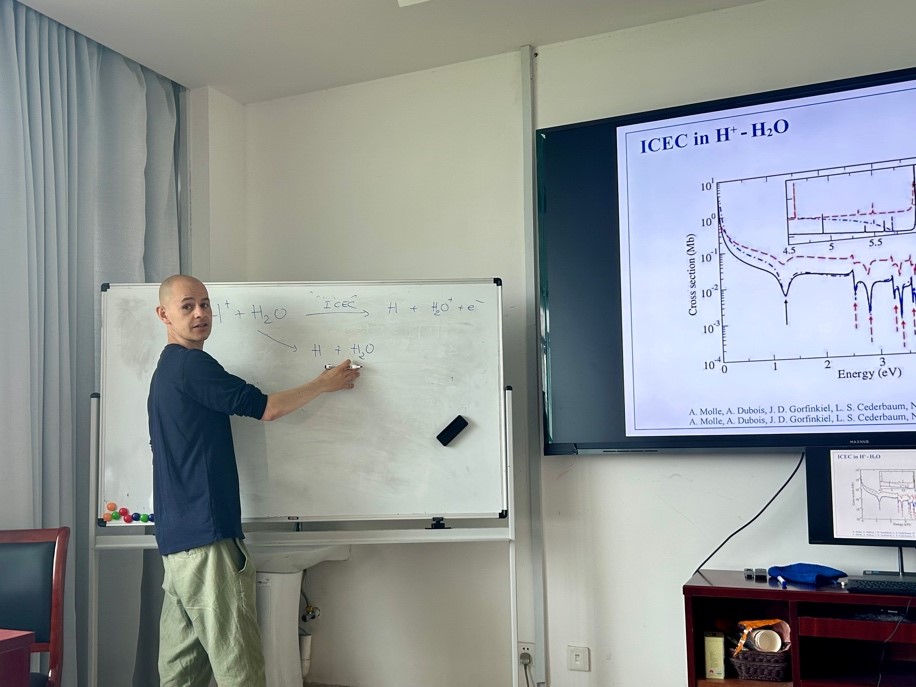 在报告中,Nicolas Sisourat 教授介绍一个最近发现的长程高能量传递机制,即原子间库仑电子捕获(ICEC)。ICEC是一种环境辅助过程,其中自由电子可以有效地附着到离子、原子或分子上。在ICEC中,电子附着的过剩能量被转移到邻近的粒子,从而使其电离。ICEC是由两个量子对象之间的电子关联驱动的超快过程。报告过程中,Nicolas Sisourat 教授与现场师生进行了热烈的讨论和交流,激发了师生们对ICEC过程的兴趣和热情,使大家受益匪浅。