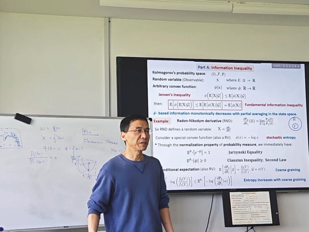 在报告中,苗兵教授详细介绍了信息热力学领域的重要概念和理论,特别是在实现E.T. Jaynes的愿景方面的最新进展。这一愿景旨在统一信息理论与统计热力学,并建立起科尔莫戈洛夫的概率论与统计数据建模之间的桥梁。在研究中,苗兵教授强调了对数-信息熵在处理独立同分布样本统计中的重要性,以及通过马尔可夫动力学自然地推导出类似于Boltzmann的H定理的动力学和随机热力学方程。此外,苗兵教授为我们介绍了该工作与大偏差理论和非平衡场论的联系,为复杂系统行为的理解提供了新的视角和框架。苗兵教授的报告拓展了我们对信息热力学领域的认识。