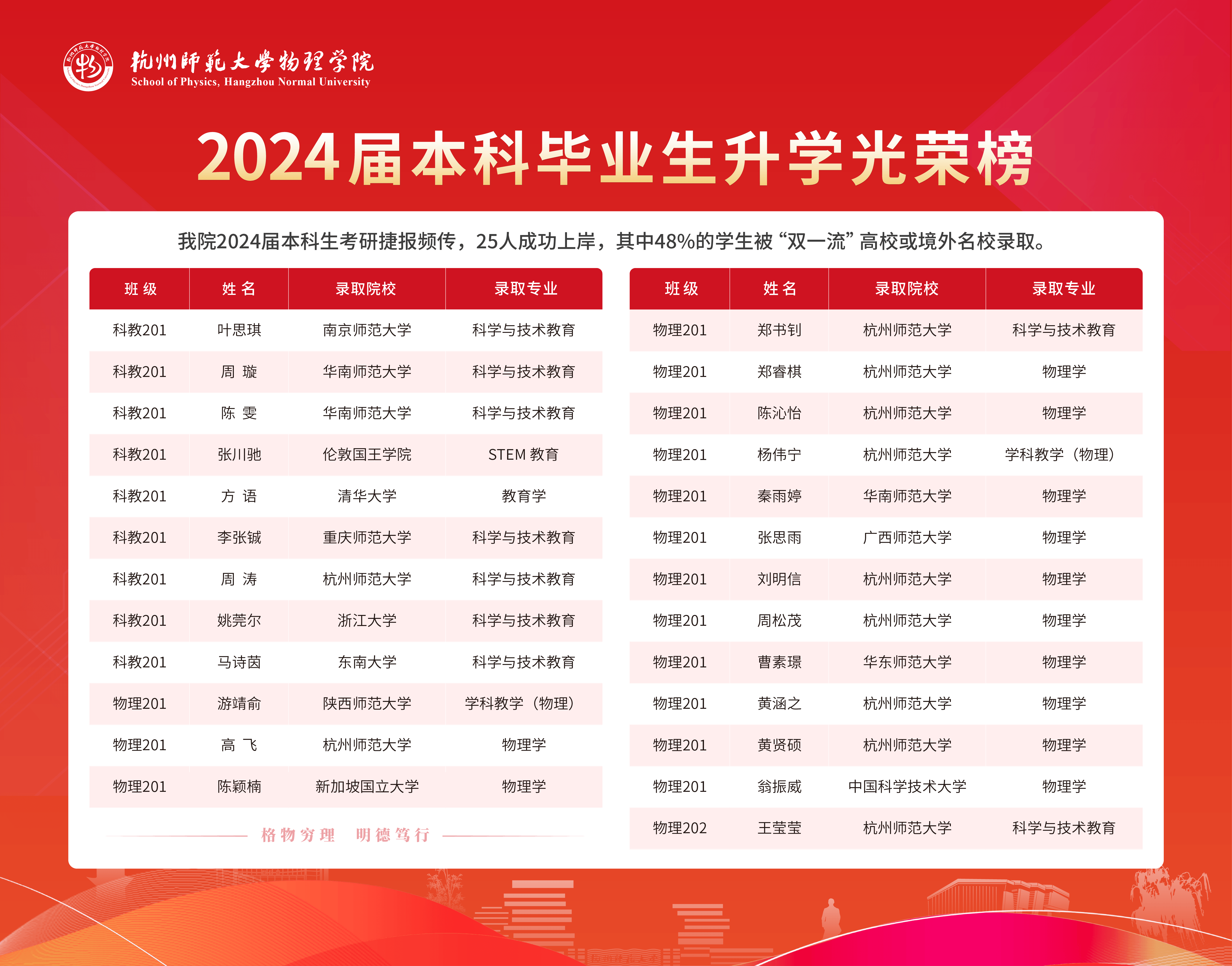 色花堂 2024届本科生考研捷报频传,25人成功上岸,其中48%的学生被“双一流”高校或境外名校录取。科教201方语同学在党员教师持续鼓励与指导下,成功考取清华大学研究生。
