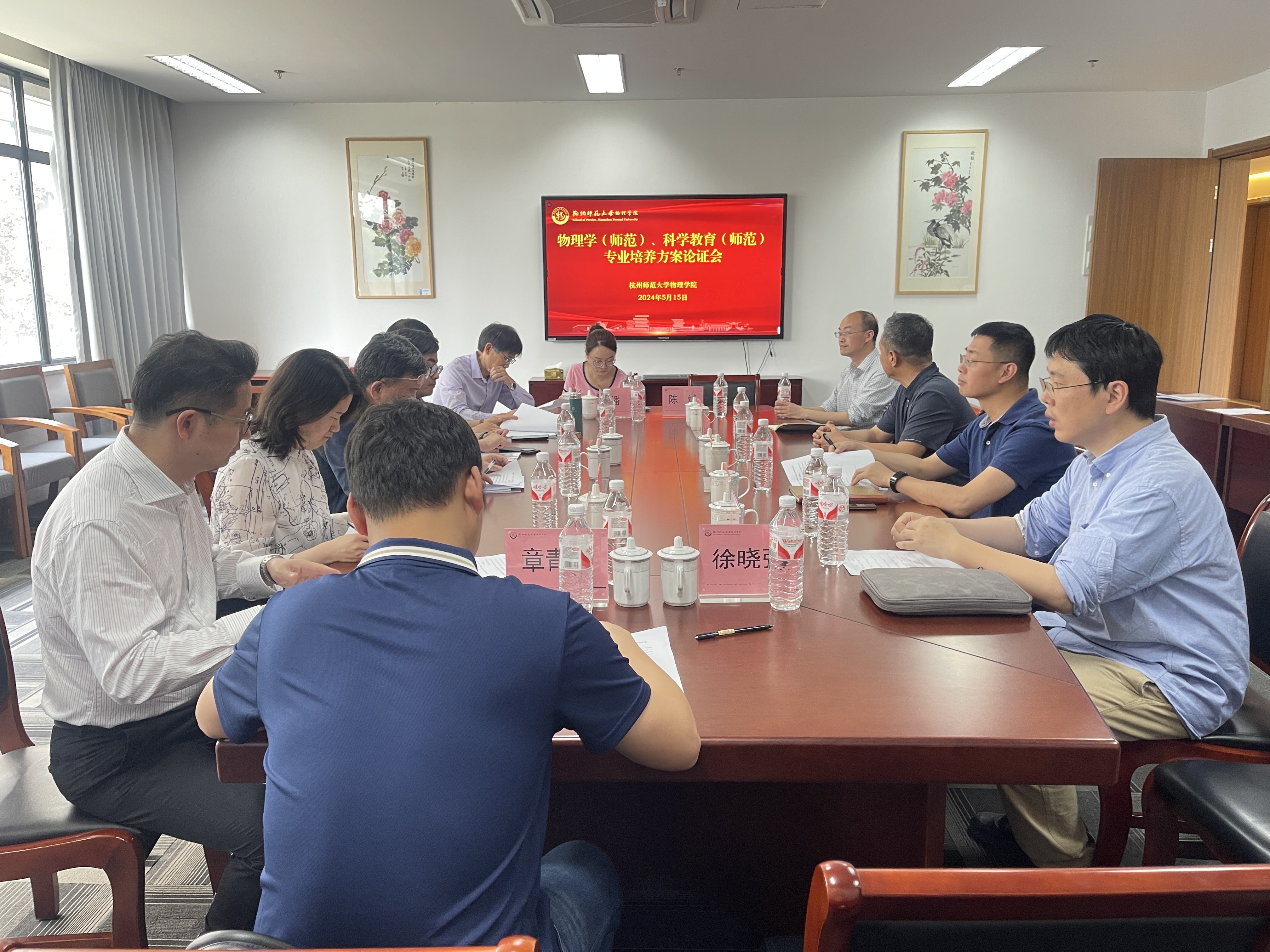 为进一步优化师范类专业人才培养方案,5月15日,学院举办物理学与科学教育专业2024级培养方案专家论证会,浙江大学方明虎教授、市教育局物理教研员屠旭滨,余杭区教育发展研究院正高级教师金加团,翠苑中学副校长沈嘉明,保俶塔实验学校申花校区副校长、物理1999届校友陈敏霞,十五中崇德中学特级教师姚青山,杭高学生处副主任、物理2014届校友章青袍,保俶塔实验学校德育主任、科教2011届校友潘进受邀担任认证专家,院长侯红生、党委书记何军,院长助理李玉科、专业负责人和教学科负责人参加认证会。