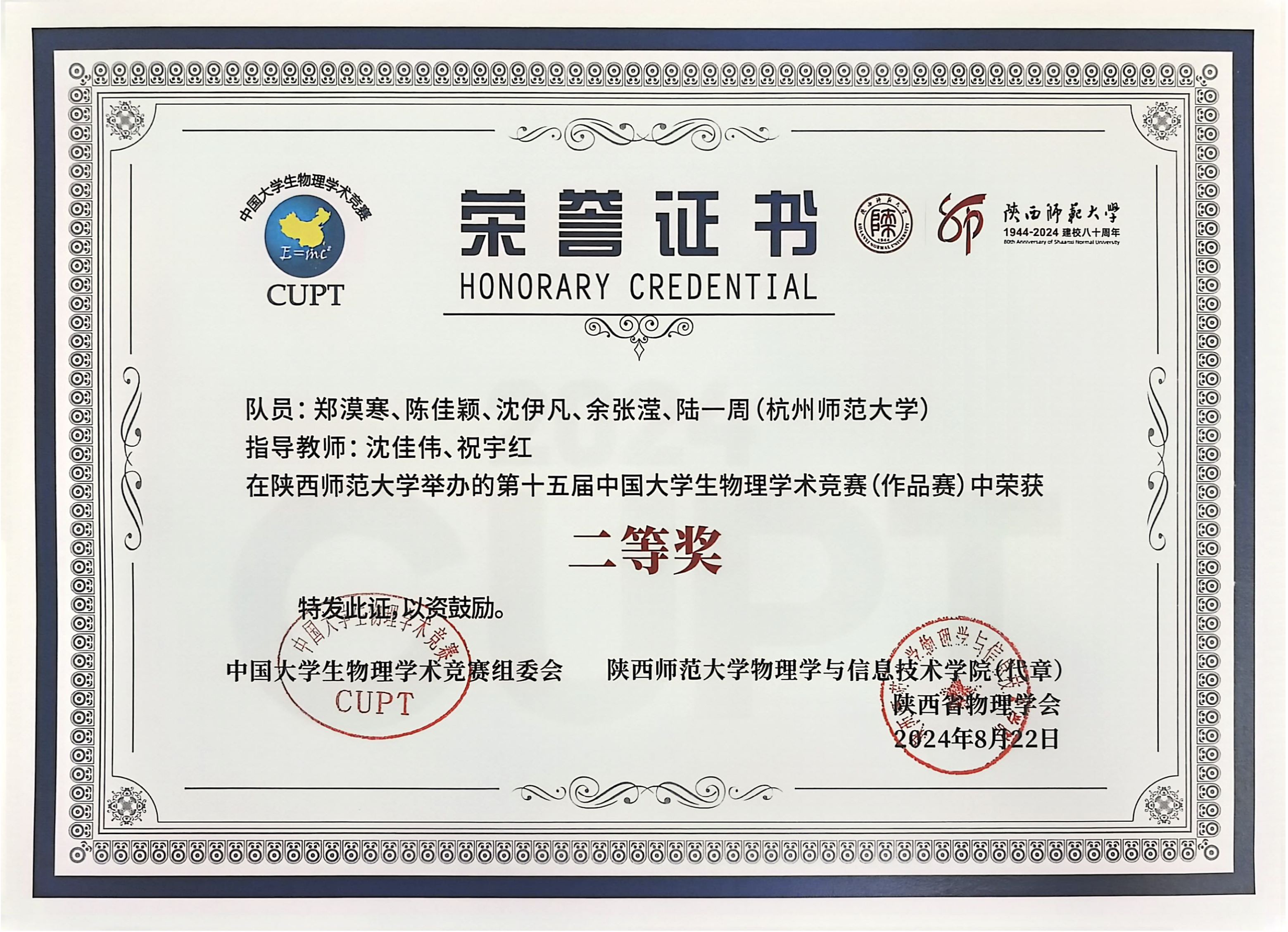 8月18日至23日,第十五届中国大学生物理学术竞赛(CUPT)在陕西师范大学成功举办。本届赛事汇聚了全国95所高校96支代表队的800余名师生。色花堂 师生首次参赛并荣获作品赛二等奖。