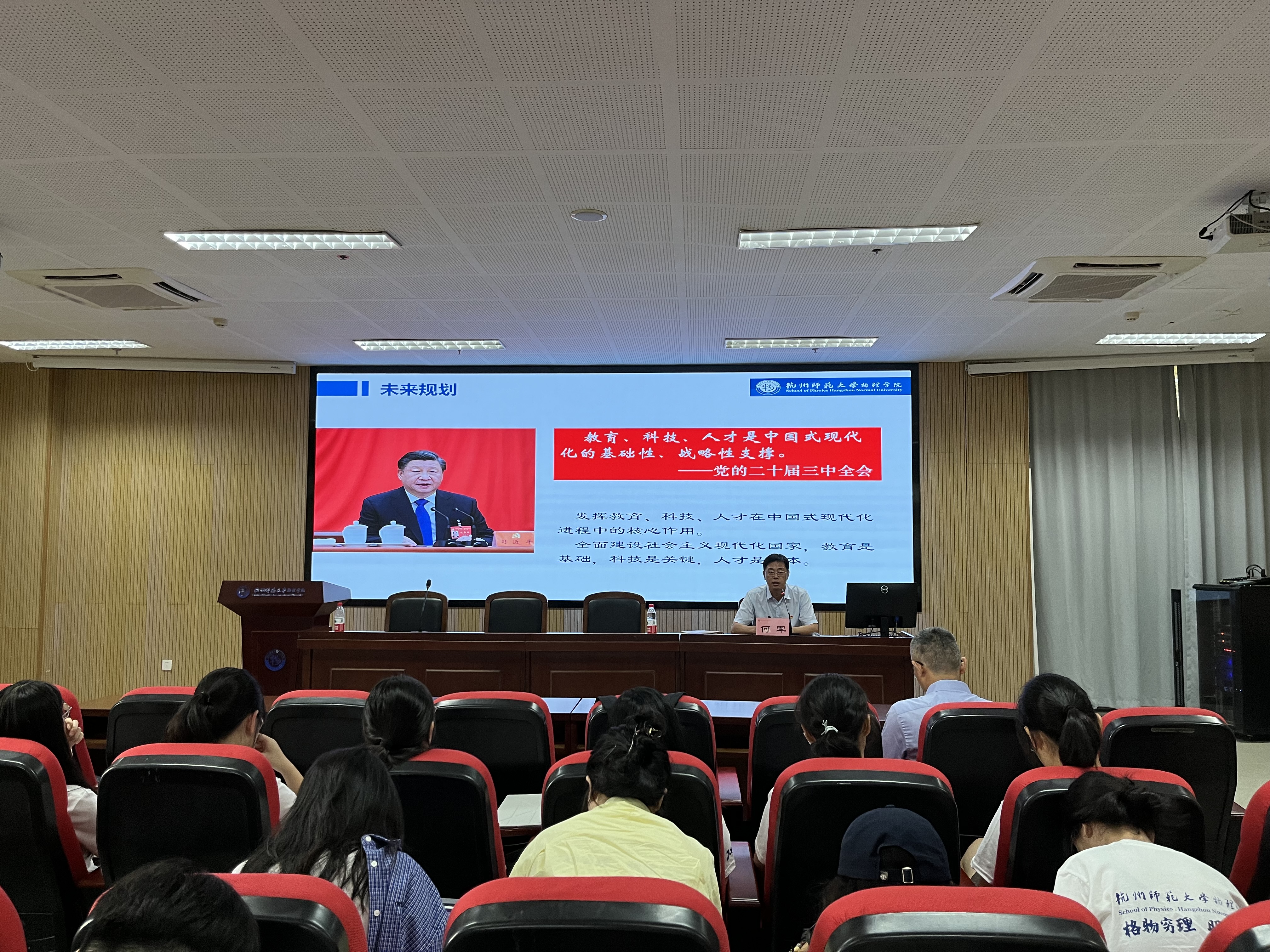 在授课过程中,何军围绕学习贯彻党的二十届三中全会精神,结合物理学科特点,阐述了教育、科技、人才在中国式现代化进程中的核心作用,以及物理学科在推动科技进步、服务经济社会发展中的独特作用,鼓励大家以师大先贤和优秀校友为榜样,勇于创新,敢于挑战,不断攀登科学高峰。