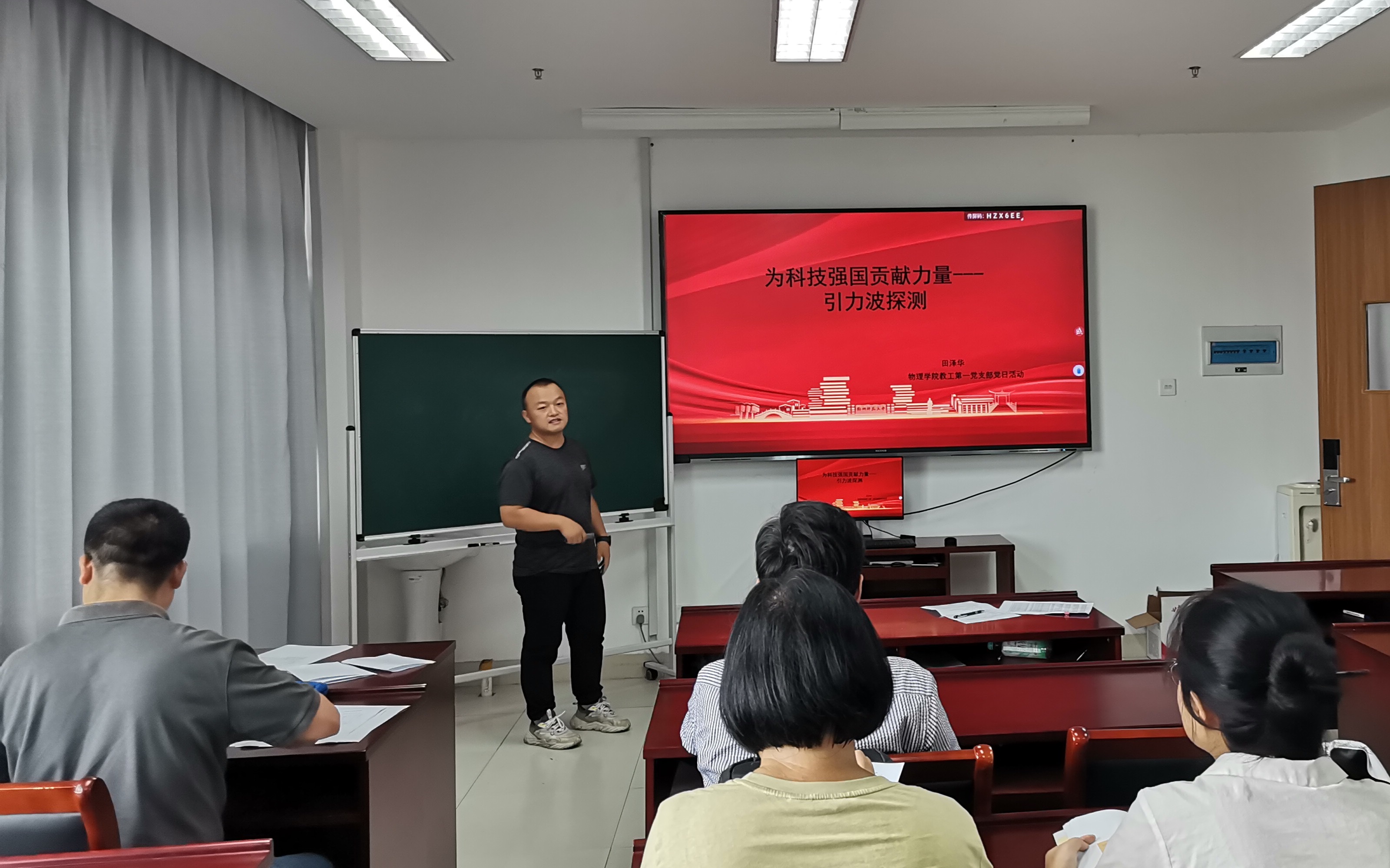 在“人人党课”环节,支部田泽华老师作了题为《为科技强国贡献力量》的报告。田老师通过对《国家中长期科学和技术发展规划纲要》、《国家创新驱动发展战略纲要》、《中华人民共和国国民经济和社会发展第十四个五年规划和2035年远景目标纲要》等国家纲领性文件相关内容的解读,阐述了深入实施科教兴国战略、人才强国战略、创新驱动发展战略,完善国家创新体系,加快建设科技强国的重要意义。接着又结合自身科研工作介绍了我国天文学研究的发展历程,以及引力波观测这一崭新的探索宇宙的方式。引力波被称为物理学皇冠上的明珠,是各国竞争的科学前沿,我国引力波探测事业的发展在推动科技强国建设过程中发挥着重要的作用。