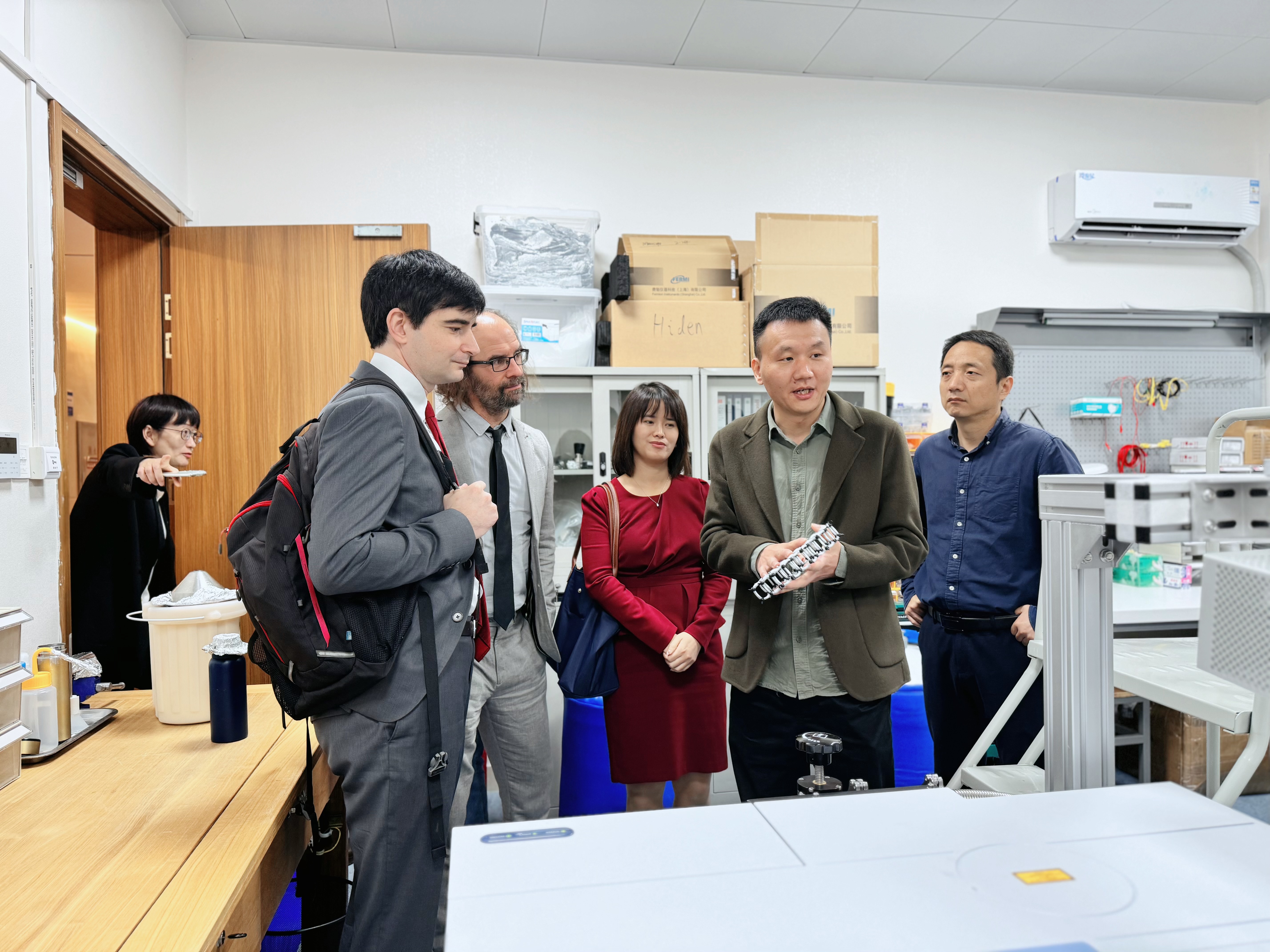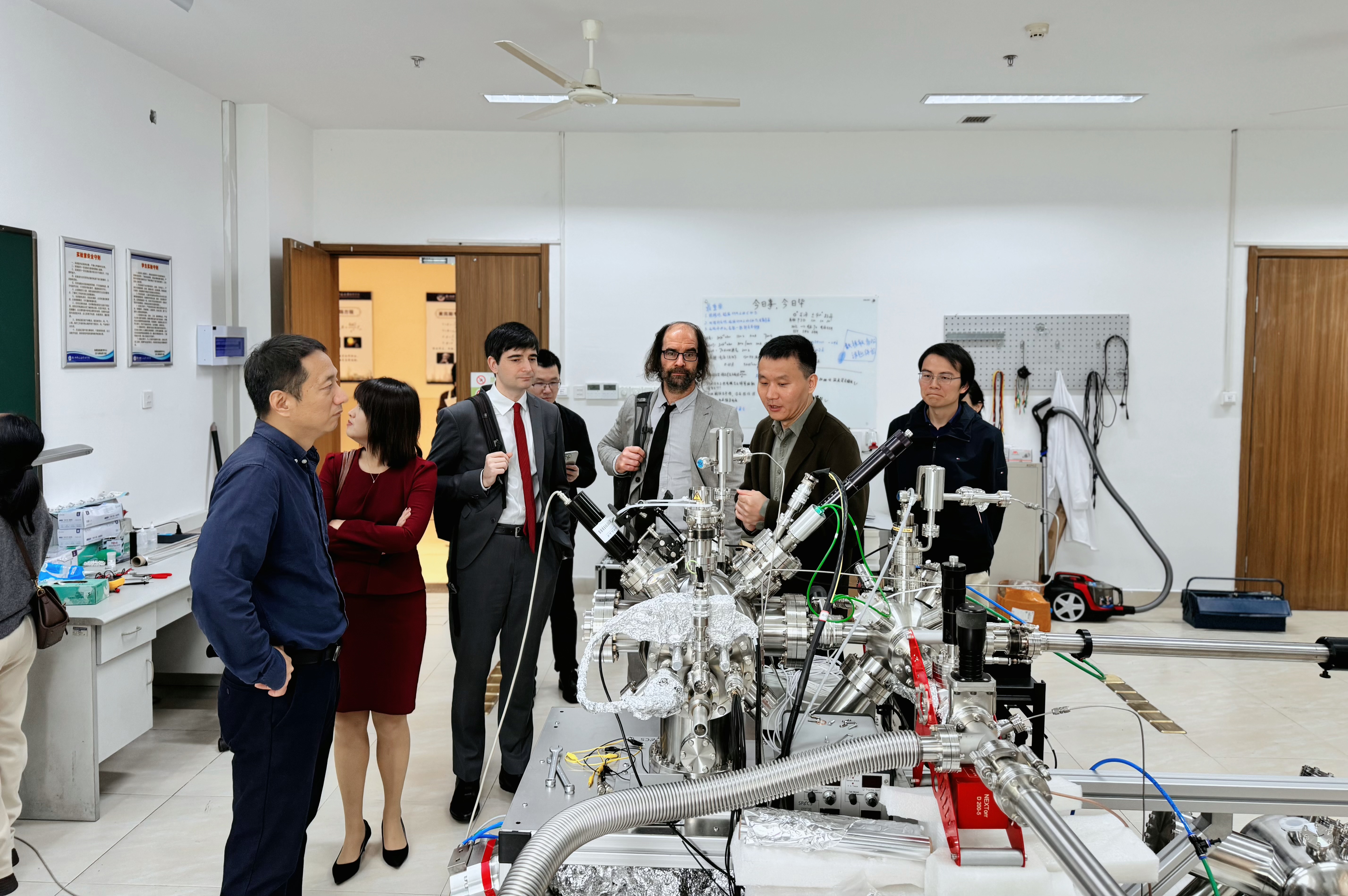 钟建强教授和鲍金科副教授分别向代表团详细介绍了学院的科研设备和正在开展的研究工作,重点介绍了学院的综合物性表征系统、超高真空红外光谱系统以及隧道扫描显微镜系统。这些先进的科研设备为学院的科研工作提供了强大的技术支持。特别是钟教授课题组搭建的超高真空红外反射吸收光谱系统,引起了代表团成员们的极大兴趣,详细询问了相关的研究情况。鲍金科介绍了他科研中经常使用的低温输运测量装置,对于揭示材料的奇异量子物性非常关键。近期发表在Nature上关于笼目超导体的研究就用到了类似的输运测量装置。这一研究成果不仅展示了鲍金科团队的科研实力,也为双方在未来的科研合作提供了更多的可能性。