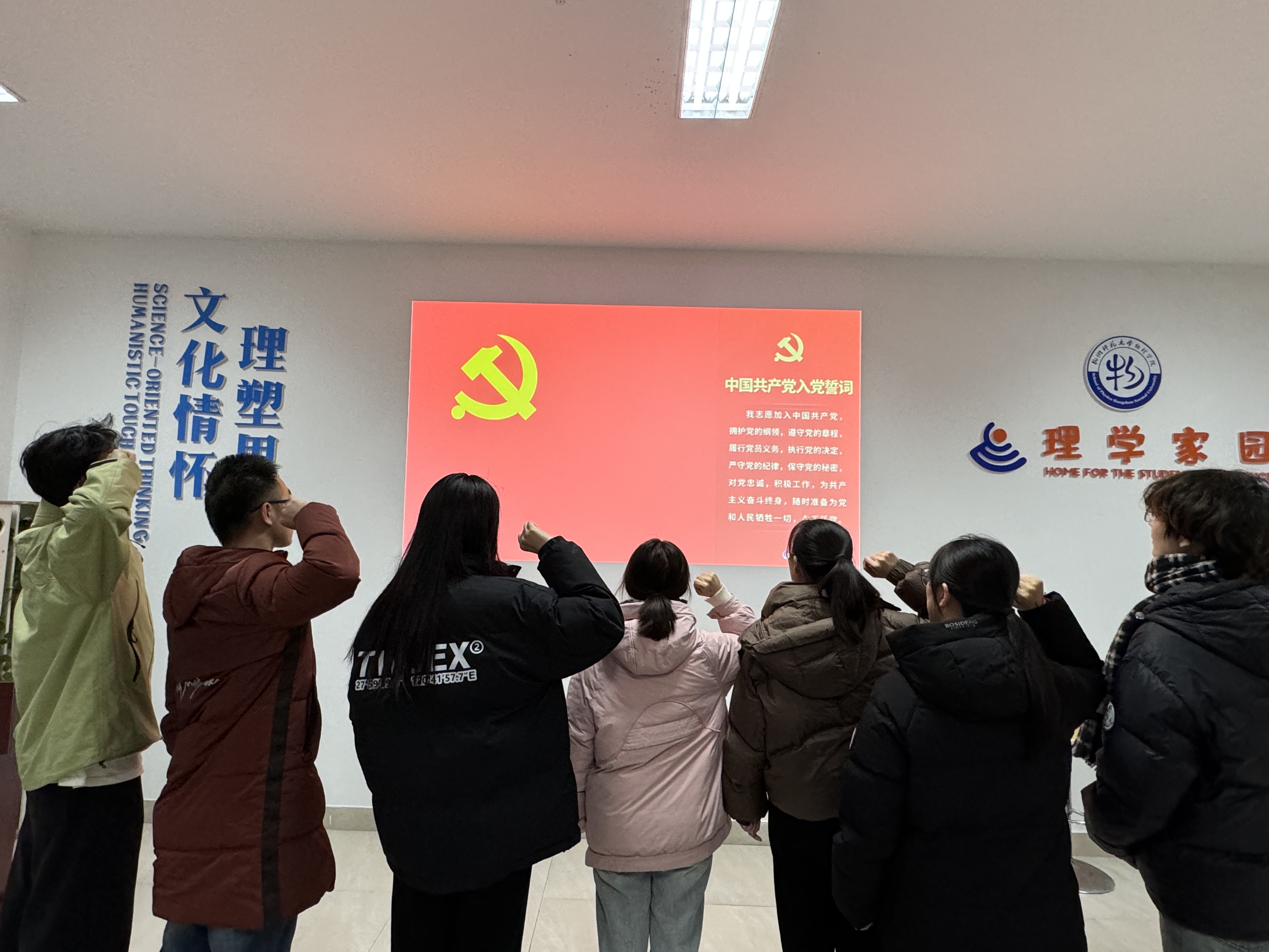 经支部讨论投票决定,通过朱致远等7人发展为中共预备党员,黄书琪等5人转正为中共正式党员,由支部书记带领大家宣读中国共产党入党誓词。