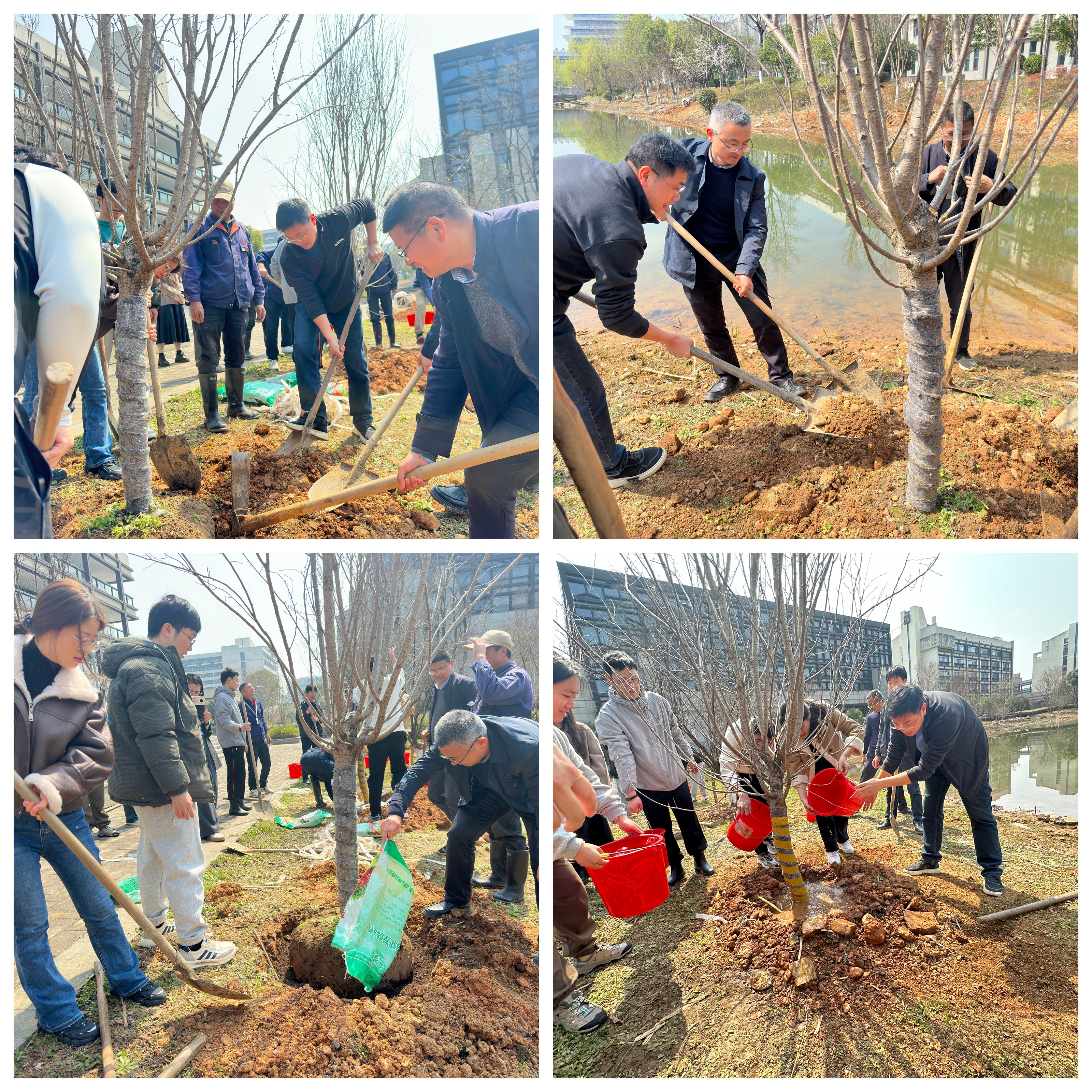 活动当天,阳光明媚,春风和煦。学院师生以饱满的热情投入植树劳动实践。在园艺老师详细介绍讲解之后,学院领导和老师们率先垂范,与同学们共同搬运苗木、挥锹铲土、固定植株、培土围堰、提水浇灌,每一道工序都做得认真细致,用辛勤的汗水为校园增添新绿。大家齐心协力,现场气氛热烈而有序。师生们不仅掌握了植树的技能技巧,更深刻体会到了劳动的艰辛与快乐,培育了崇尚劳动、尊重劳动的价值观念,他们以实际行动诠释了“劳动最光荣、劳动最崇高、劳动最伟大、劳动最美丽”的深刻内涵。