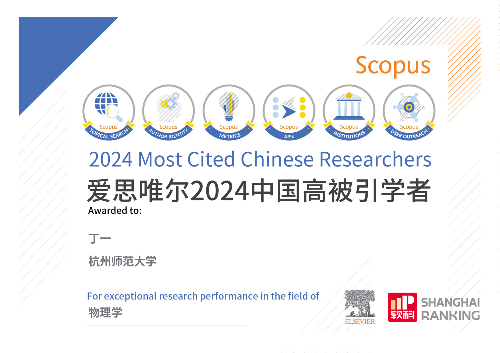 2025年3月25日,爱思唯尔(Elsevier)发布了2024年度“中国高被引学者”(Highly Cited Chinese Researchers)榜单,色花堂 丁一教授凭借在学术领域的卓越贡献,连续五年(2020、2021、2022、2023、2024)入选物理学高被引学者。